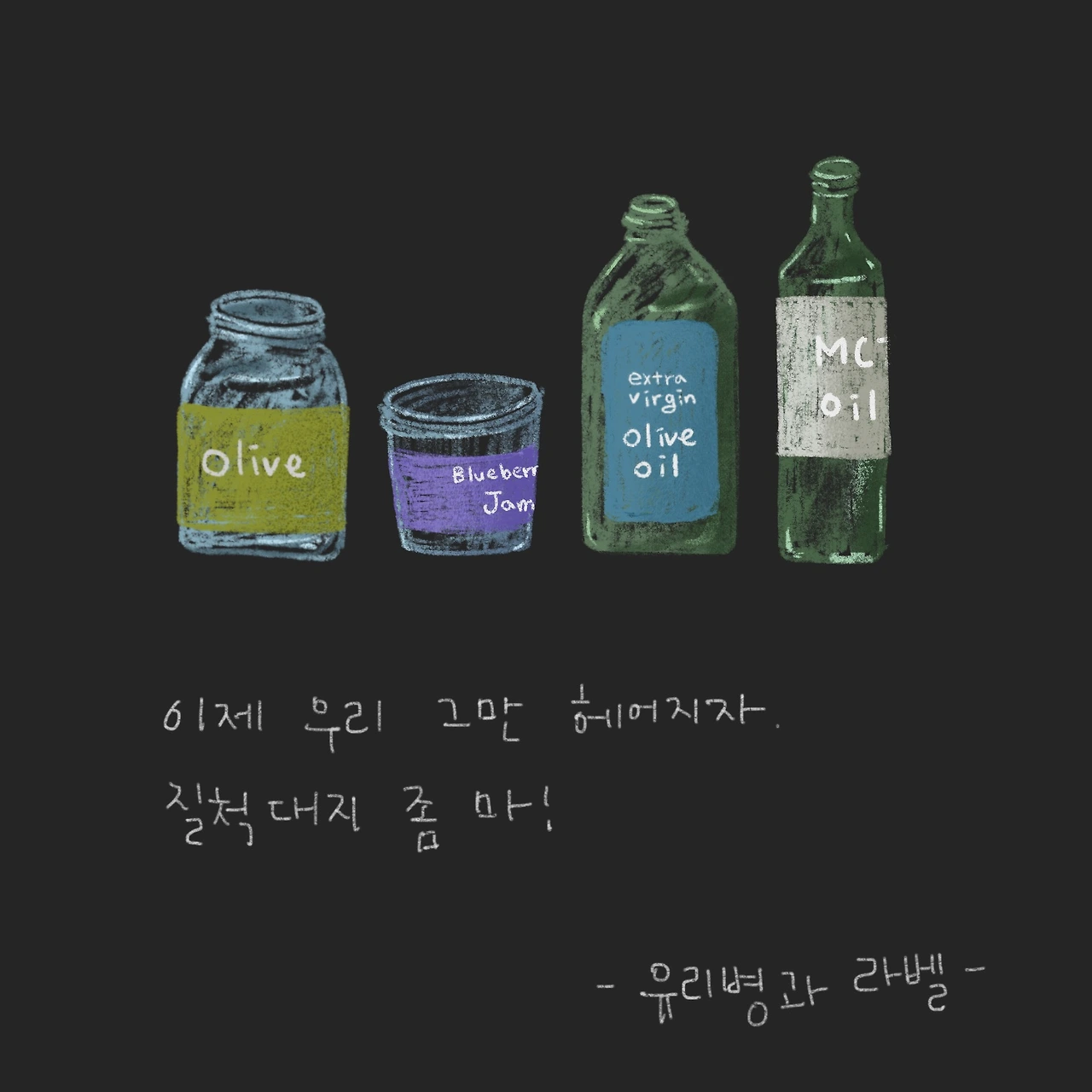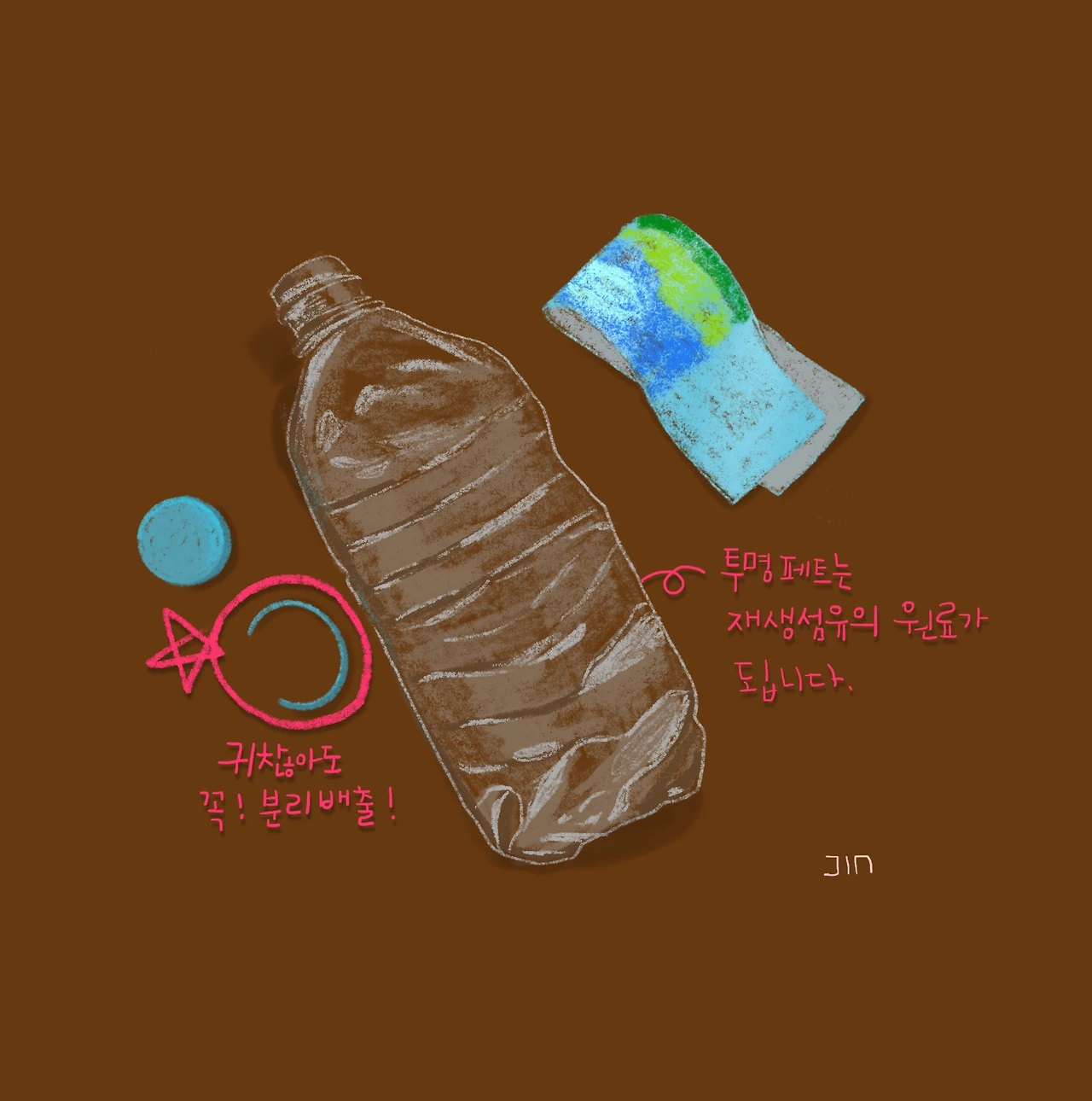 성공한 사람들을 연구한 자기 계발서를 보면 거의 대부분이 '이타적인 마음'이 그 사람을 성공으로 이끌었다. 고 말하며 네가 사람들을 위해서 세상을 위해서 할 수 있는 일이 무엇인지 고민해보라는 내용이 꽤 자주 등장한다. 음. 그래? 그럼 나는 뭘 할 수 있을까? 어릴 때 꿈은 그림으로 세상을 아름답게 만드는 거였는데... 그래! 그림으로 세상을 깨끗하게 만드는 거야! 어느 날 갑자기 호기롭게 제로 웨이스트 그림 계정을 만들었다. 첫 피드는 라벨 분리를 위해 기다리고 있는 병들을 그린 거였다. 내용은 정말 대단할 것도 없는, 라벨을 분리하지 않으면 분리배출을 못하니 저렇게 유리병이 쌓이고 있다 얼른 라벨 분리를 해야겠다 뭐 이런 내용이었다. 그렇게 시작된 나의 원대했던 제로 웨이스트 계정은 나 이렇게 분리수거 잘한다, 나 지퍼백도 안 쓴다, 나는 천연수세미로 설거지한다 이런 아주 소소한 제로 웨이스트 피드를 올리고 있었다. 이게 다였다. 그러다 어느 날 문득 내가 진짜 제로 웨이스트를 실천하는 게 맞는 건가 하는 생각이 들었다. 일주일만 지나도 일회용 플라스틱 더미가 눈덩이처럼 불어나 있고, 마트 가서 장이라도 한번 보고 오면 나는 비닐을 사러 마트에 간 거였나 싶을 정도로 많은 비닐이 나왔다. 그야말로 '현타'가 온 것이다. #제로 웨이스트라는 태그를 내 피드에 쓰기가 민망할 정도였다. 내 삶과 제로 웨이스트는 관계가 없어 보였다. '진정성'이라는 단어 앞에서 나의 제로 웨이스트 계정은 일시정지 상태가 되었다.