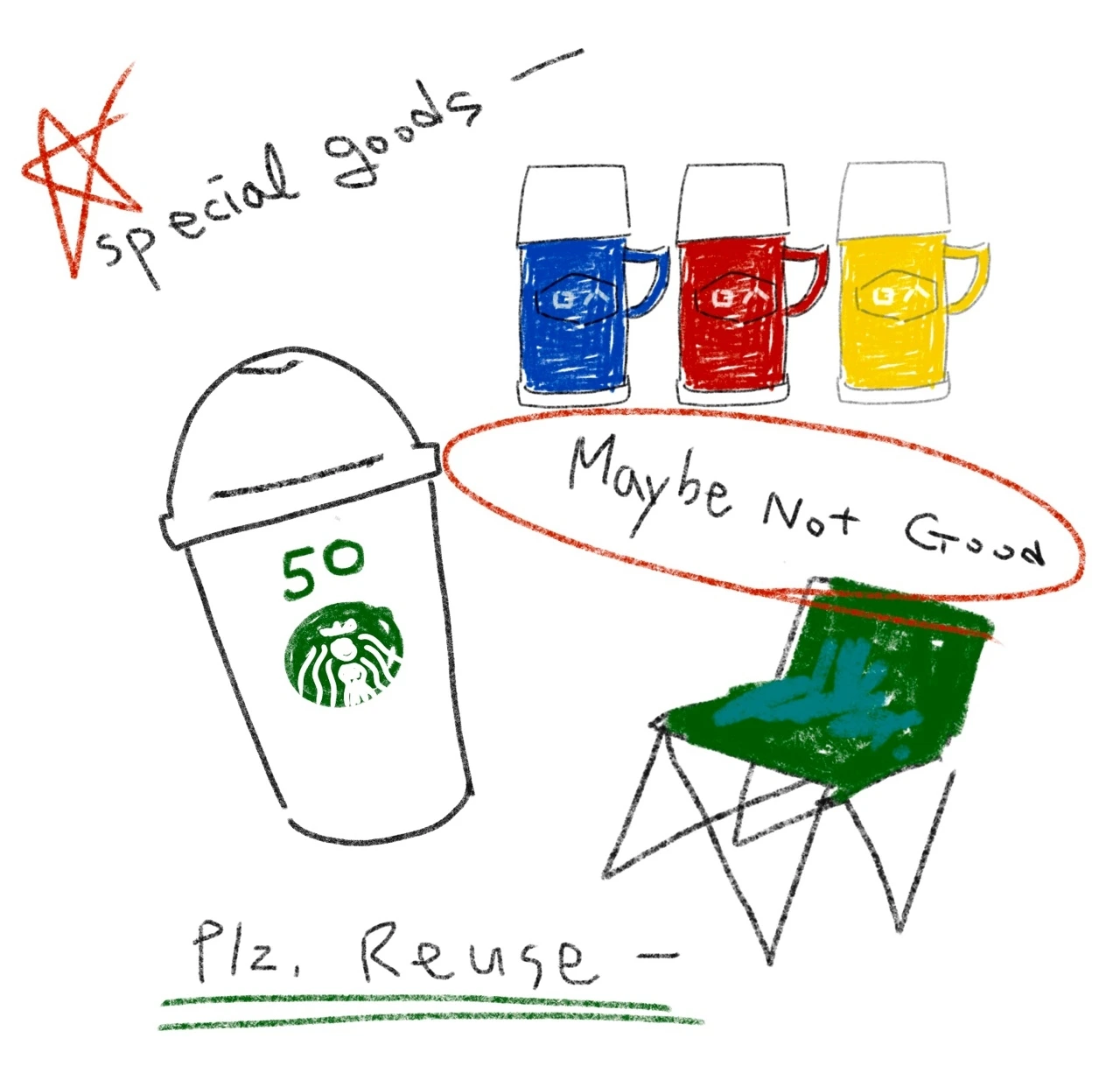 덧, 리유즈 컵을 그리기 위해 검색하다 알게 된 사실, 이 50주년 리유저블 컵 증정 행사 때 추가 인원 보충 없이 진행이 되어 직원분들이 많이 힘들었던 모양이다. "도망치고 싶었다"는 이 회사 직원들의 트럭 시위 소식을 보게 되었다. 잦아도 너무 잦은 굿즈 행사에 직원들 뿔이 단단히 난 모양이다. 이번 기회에 친환경의 가면을 쓴 굿즈 행사가 좀 줄었으면 좋겠다.