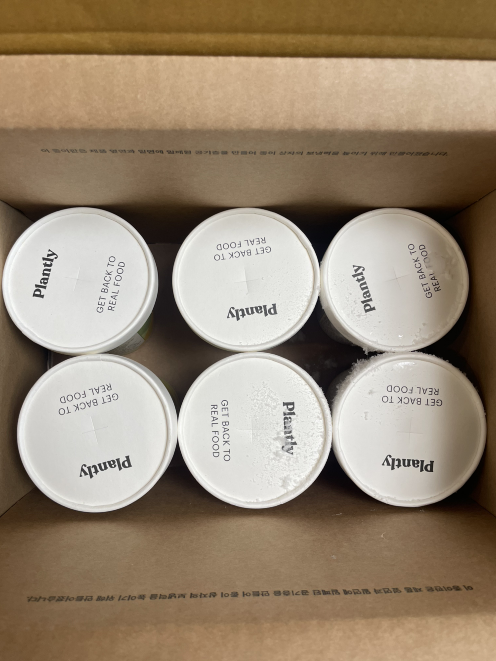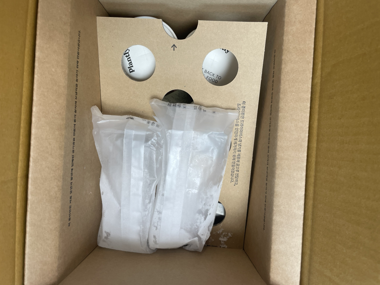 그런데 막상 받아 본 플랜틀리 배송 상자에서는 드라이아이스가 들어 있는 부직포백과, 종이컵 입구에 실링 된 비닐 말고는 모두 종이뿐이었다. 바쁜 아침 쉽게 그린 스무디 한잔을 갈아 다시 그 종이컵에 담아 바로 출근할 수 있도록, 뚜껑도 있는데 종이컵과 같은 재질인 코팅된 종이에 십자로 빨대를 넣기 위한 구멍이 있었다. 그럼 빨대는? 제공되지 않는다. 내가 가진 종이 빨대나, 스테인리스 빨대를 이용할 수 있어서 오히려 나는 좋다고 생각한다. 언젠가 비닐파우치에 들어있는 두유를 한 박스 주문했더니 원치도 않던 플라스틱 빨대 한 묶음이 들어 있어서 매우 당황스러웠던 적이 있다.