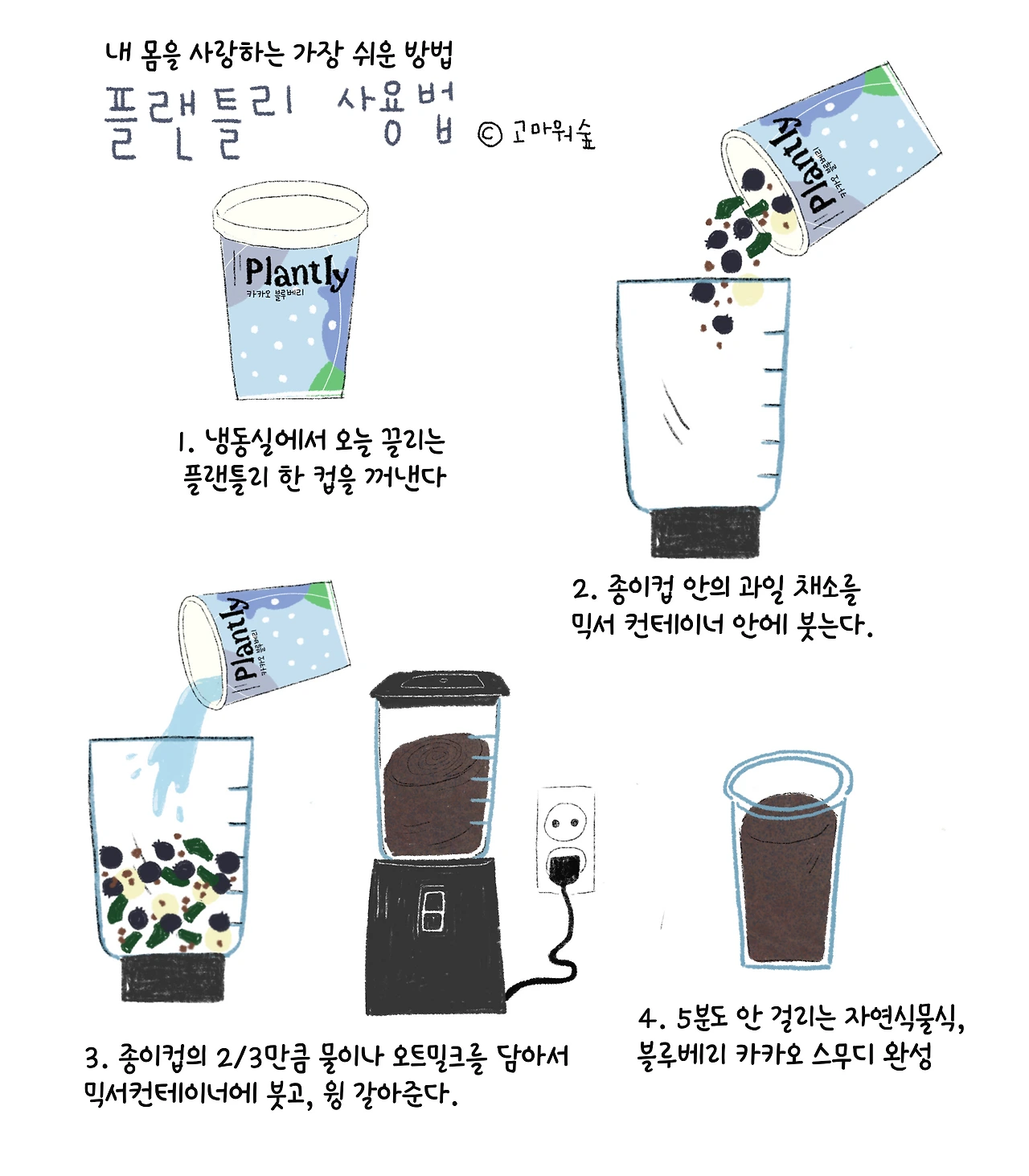 배송된 플랜틀리 스무디 한 컵을 믹서 컨테이너에 넣고, 그 컵의 2/3 정도의 물이나 음료종류를 채워 믹서에 넣고 갈아서 마시면 건강한 자연식물식 한 끼가 간편하게 해결된다.