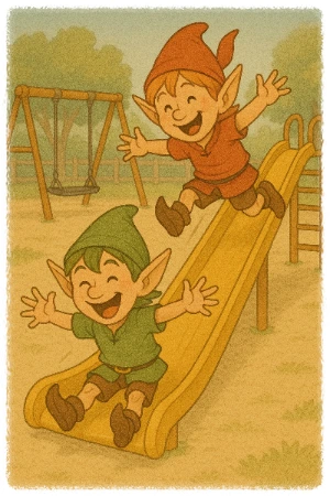 그리와 보기는 서로 윙크를 찡긋하며 엄지와 검지를 탕탕 튕겼다. 그리고는 쫑긋 나온 두 귀를 엘프모자에 쏙 집어넣고는 휘파람을 휘휘 불며 쪼르륵 미끄럼틀 계단을 오르고는, 노랑 미끄럼틀을 슝 타고 내려왔다.