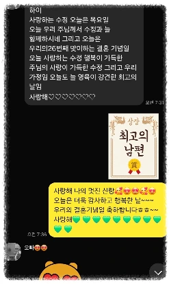 이른 아침, 남편의 카톡 메시지가 울린다. 새벽 일찍 출근하는 남편은 늘 내가 일어나는 시간에 맞춰 매일 모닝 메시지를 보낸다. 오늘은 특별히 우리의 스물여섯 번째 결혼기념일을 축하하는 문장이 덧붙여져 있다. 아침부터 기분이 좋다. 남편에게 답장을 하고 ‘최고의 남편상’ 이모티콘도 덧붙여본다.