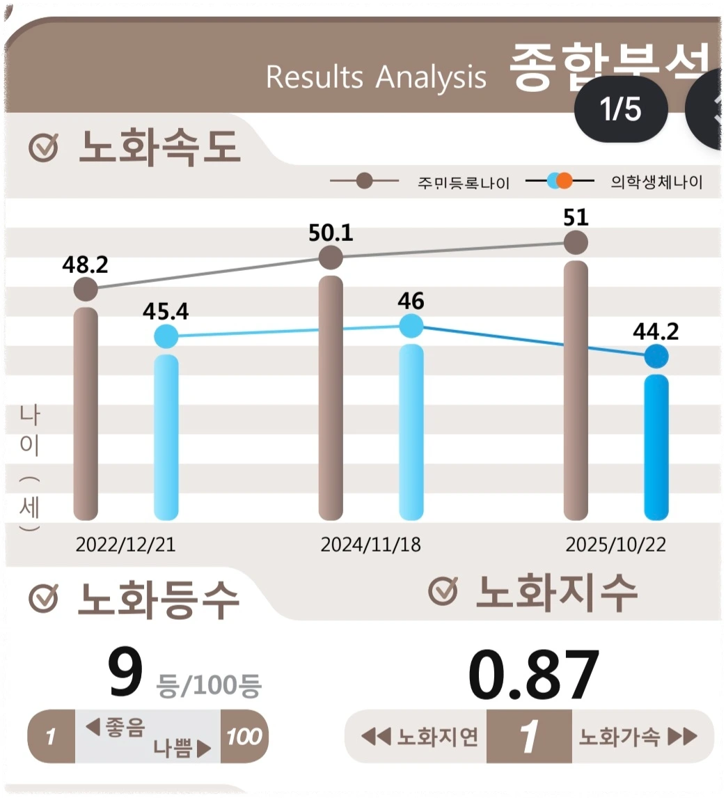 오늘 마침 얼마 전 받았던 건강검진 결과가 도착했다. 다행히 남편과 나 모두 건강에 이상이 없고, 전반적인 수치도 좋은 편이었다. 특히 둘 다 노화지수가 0.87로 동일하게 나온 게 너무 놀라웠다. 남편은 백 명 중 8등, 나는 9등이었다.
