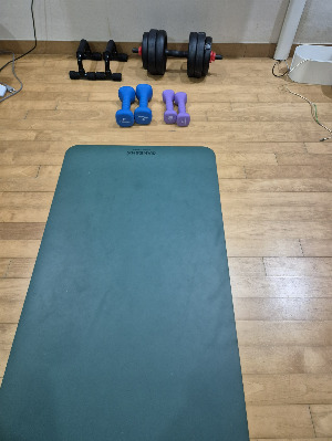 ▲중년부부의 거실. 요가매트와 각종 운동기구가 있는 거실풍경.거실에서 늘 생활속의 운동을 할 수 있는 셋팅이 되어 있다. 매트, 덤벨, 스쿼트 등등. ⓒ 이수정