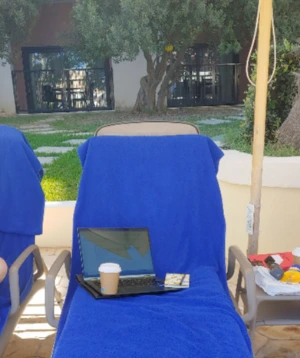 수영을 너무 좋아하는 딸과 신랑은 수영장과 바다에서 하루종일 수영할 수 있다는 것에 이미 들떠 있었고, 리조트에 들어가자마자 트렁크에서 수영복부터 꺼내며 신나 했다. 반면, 발이 바닥에 닿지 않으면 물속에서 패닉이 오는 수영 젬병인 나는 일단 발이 충분히 닿는 썬배드 주변의 작은 수영장이면 충분하다고 스캔을 끝냈다. 나는 파라솔 그늘 아래 썬배드에서 책도 읽고, 글도 쓰고 하는 로망을 실현하겠다는 의지로 책과 노트북을 먼저 트렁크에서 꺼냈다.