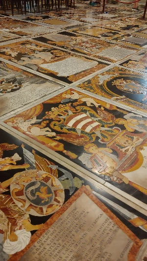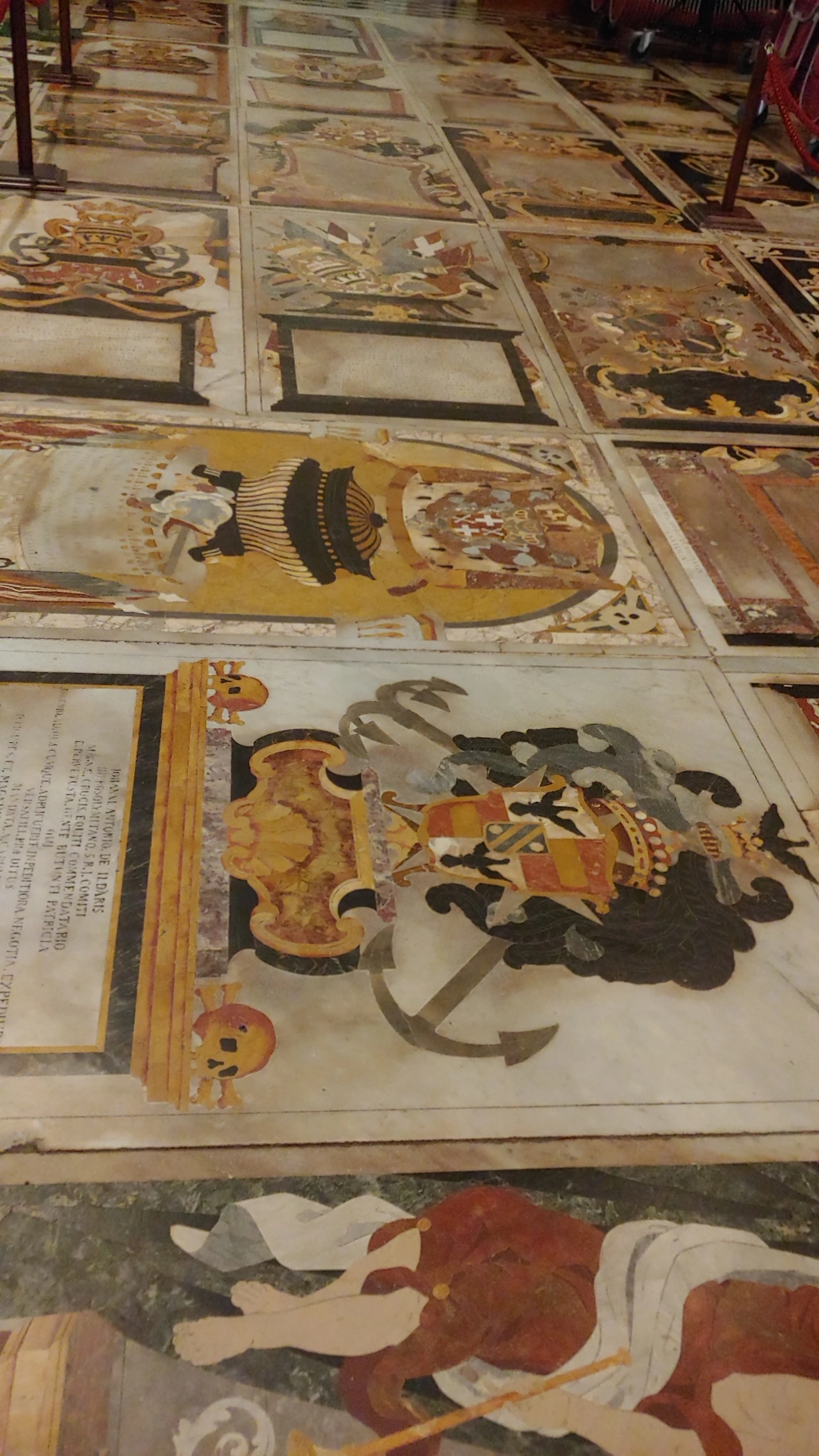 처음에는 금빛으로 번쩍이는 벽면과 천장, 그리고 수많은 예술품들을 보느라 혼이 쏙 빠졌다가 성당 바닥의 이 화려한 대리석들이 모두 묘비명이라는 사실을 알고는 나는 얼음이 되어 그 자리에 한참을 서 있었다. 어쩌지, 순간 공중부양이라도 하면 좋겠다 싶었다. 비록 무덤 위에 서 있는 것은 아니었지만 그 묘비석에 그 기사들의 영혼이 깃들어 있는 듯했다.