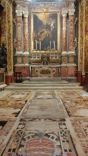 성 요한 대성당의 가장 하이라이트! 가장 특징적인 것은 바로 성당내부의 바닥이다. 아무리 성대하고 화려한 유럽의 성당들도 성 요한 대성당의 화려함을 따라가기 쉽지 않은 이유는 바로 이 바닥 때문인 것 같다. 이곳의 바닥은 400여 개의 기사단의 묘비석으로 이루어져 있다. 직사각형의 같은 크기지만 각 묘비석의 대리석 색, 문구, 문양, 상징그림 등은 다 다르다. 고대 그리스어로 쓰여있기 때문에 일일이 해석을 못하는 것이 아쉬웠지만, 그 묘비석에 한 인간의 일생을 갈음하는 문구들이 얼마나 깊은 글들로 채워져 있을지, 숙연한 마음이 든다.