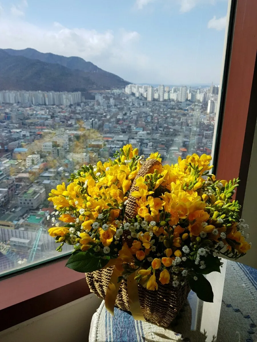 "프리지어 꽃바구니 보내줘서 고맙다"