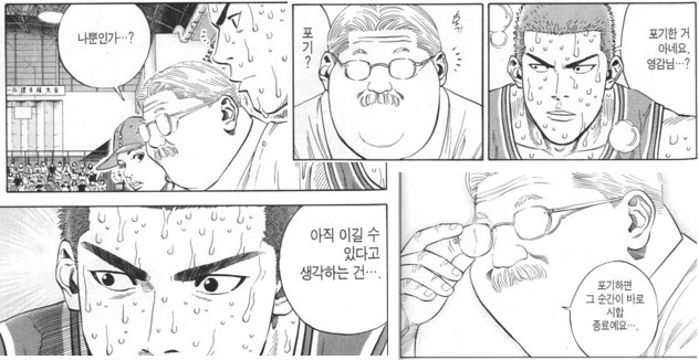 안선생님의 대사이자 슬램덩크 전체 대사 중의 top3 안에 드는 대사가 바로, '포기하면 그 순간이 바로 시합종료예요..' 라는 대사일 것이다. 이 말을 듣고 중학 MVP를 차지한 정대만이 안선생님 앞에서 '농구가 하고 싶어요..' 라면서 울게 만든, 임팩트 갑의 대사이다. 사실 리더가 포기하지 않는 것은 팀원으로서 부담스러울 수도 있다. 그게 고생을 자초하고 워라밸을 해친다고 생각하기 때문이다. 그러나 한편으로 또 쉽게 포기하는 리더들을 모시는 팀원들의 입장은 다른 생각도 든다. '아 도대체 뭘 끝까지 할 수가 없네.' , '그래도 한번 해보는 데까지 해보고 싶은데..' , '맨날 중간에 그만두니까 뭐 성장하는 게 안 느껴지네..' 와 같은 생각도 드는 것이 사실이다. 끝날 때까지 끝난 게 아니다. 일단 할 수 있는 한 최선을 다하고 결과에 승복하자. 안선생님은 해남에게 졌다고 해서 팀원들을 전혀 나무라지 않았다.