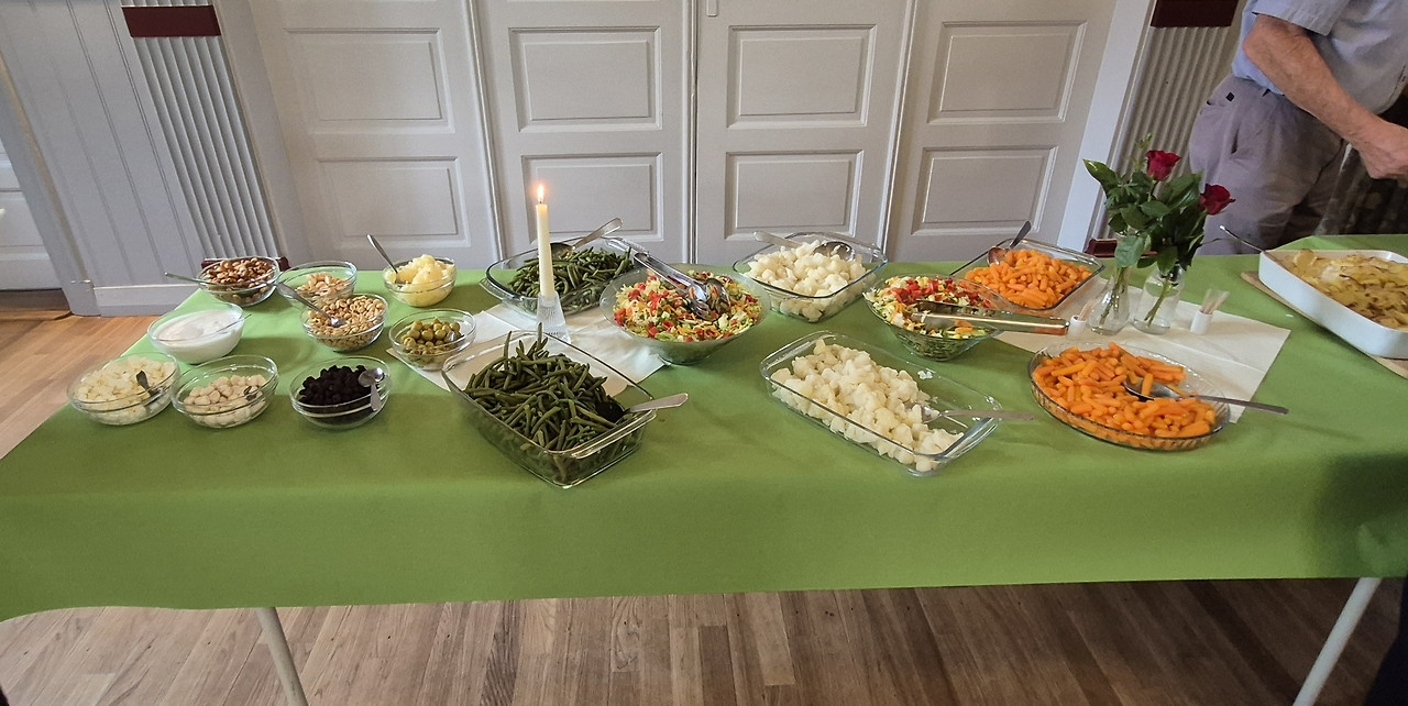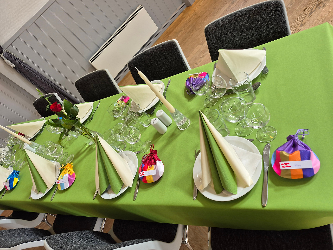파티는 오전 11시 반에 시작되었지만, 손님맞이 준비와 한국에서 가져온 작은 답례품을 놓기 위해, 우리는 한 시간 일찍 도착했다. 10년 전 시부모님 칠순 때도 찾았던 연회장이었지만, 기억이 가물가물했다. 실내는 양초와 작은 화분으로 소박하게 꾸며져 있어, 덴마크 특유의 아늑한 절제미가 돋보였다. 연두색 콘셉트로 단조롭게 세팅된 테이블 위에 선물로 가져온 알록달록한 복주머니를 놓으니, 예쁜 포인트가 되었다.