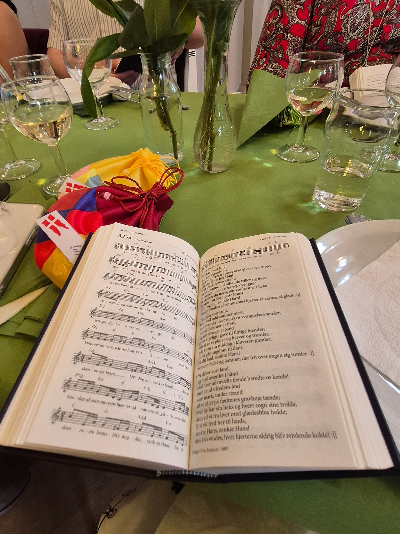 와인잔을 포크로 두드리는 소리에 사람들이 조용해졌다. 시아버지의 환영사가 이어졌고, 이내 새우를 곁들인 오픈 샌드위치와 와인이 스타터로 서빙되었다. 그리고는 시어머니가 노래 부를 책의 쪽수를 불러 주었다. 마치 교회의 성가집처럼 두꺼운 책에는 600여 곡이 수록되어 있었다. 연로한 피아노 연주자를 도와 딸과 함께 노래책 수십 권을 파티장으로 옮길 때, 딸이 말했다.