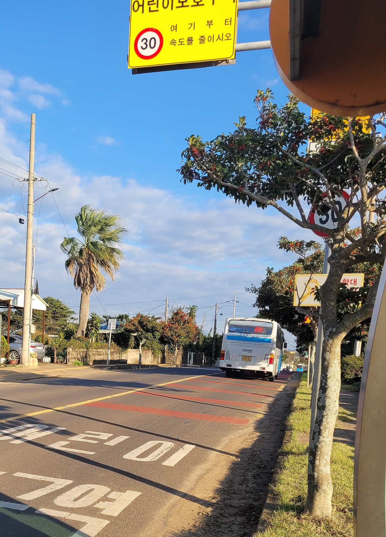 병원 예약 시간에 맞춰 '제주도 버스로' 앱에서 버스 시간을 확인하고 나간다. 아무도 없는 정류장에서 나 홀로 버스를 기다린다. 배차 간격이 15~25분인 게 아쉽다. 더 자주 운행된다면 가까운 거리라도 운동 삼아 자주 이용할 텐데. 이어 맑은 하늘을 꼭 닮은 버스가 도착하자, 기대와 설렘이 교차한다. 서귀포 시내가 기점인데 승객이 많지 않다. 어르신 서너 분과 젊은 사람들 두어 명이 타고 있다. 도로에는 차도 거의 없고 정류장에 승객도 없으니, 버스는 택시처럼 쭉 달린다.