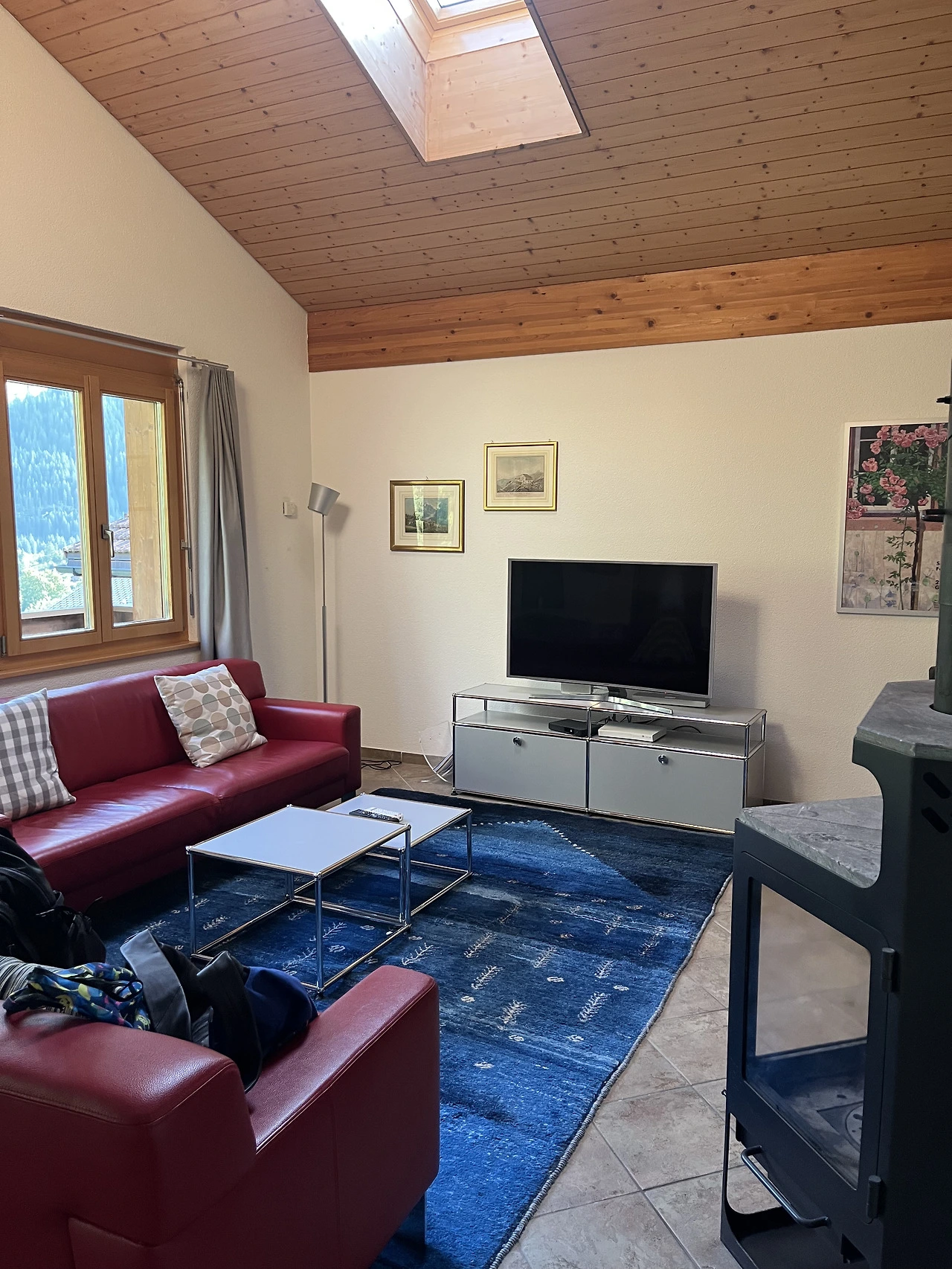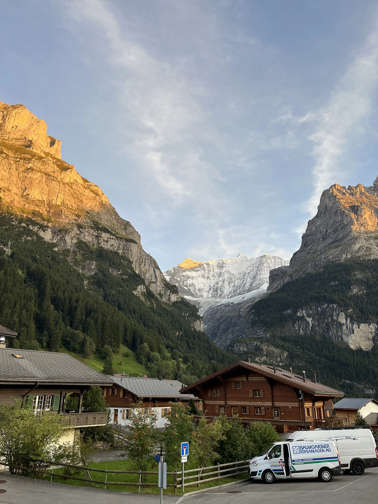 그린델발트에 있는 숙소를 찾기는 쉽지 않았다. 구글지도로 검색하며 굽이굽이 골목길을 헤매어 겨우 찾아갔는데 막다른 골목에 빌라처럼 여러 가구가 모여 있는 3층 목조건물 샬레가 나타났다. 보이지 않는 안쪽에 숨어 있었는데 덕분에 물소리와 카우벨 소리만 간간이 들리는 조용한 샬레 숙소였다. 2층으로 된 숙소는 아래층에 욕실과 침실 하나, 커다란 거실과 주방이 있고, 2층에 2인용 침대가 있는 방이 2개, 하늘이 보이는 유리 천장이 있는 화장실을 갖춘, 서울의 우리 집보다 훨씬 넓고 호사스러운 숙소였다. 무엇보다 베란다에 나가서 보는 뷰가 한 편의 그림엽서였다. 빙하(또는 만년설)와 산과 초원을 함께 감상할 수 있다니.