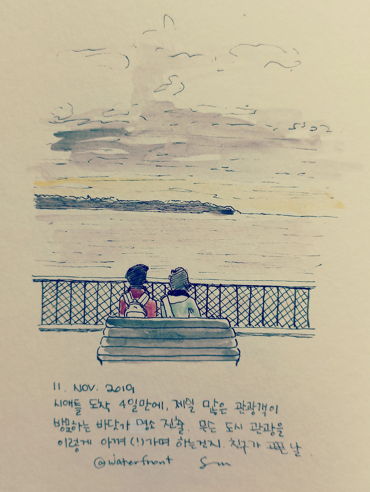 시애틀 입성 나흘 만에 워터프런트 진출. 지는 해를 보며 친구와 아무 말 않고 앉아있기를 해보고 싶었으나 아무 말 안 할 거면 혼자여도 되는데??