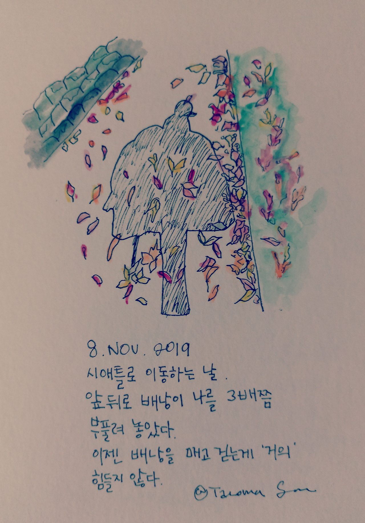 자기 몸의 2/3쯤 차지하는 커다란 배낭을 메고 그 무게에 못 이겨 허리를 반쯤 접은 채 신발을 신는 나에게, 낯선 도시로 떠나는 말동무의 안위가 많이 걱정스러웠나 보다.