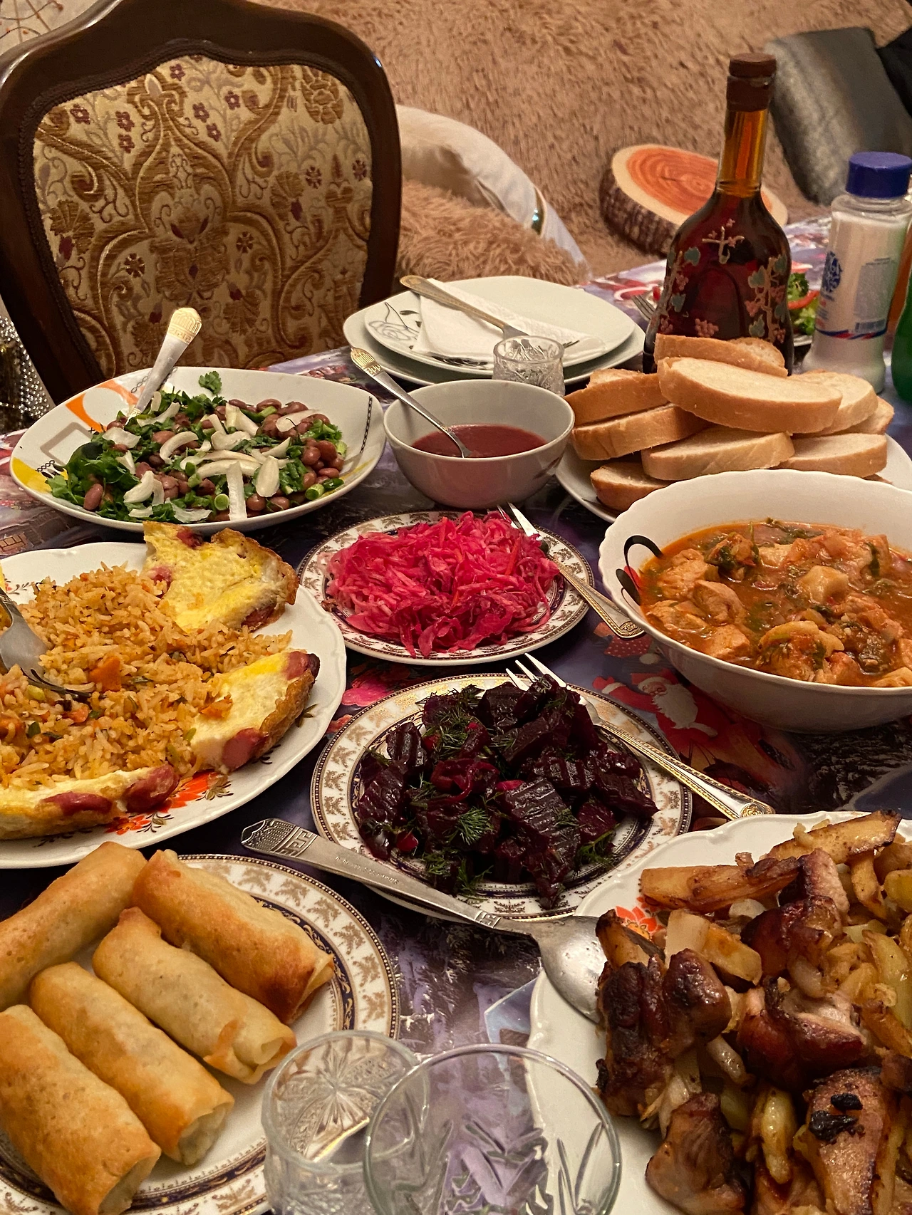 트리 옆 식탁에는 조지아식 ‘상다리 부러지는’ 식사가 차려져 있었다. 바코의 어머님이 손수 빚어 보낸 조지아식 만두, 킹칼리부터 매콤한 치킨 스튜, 조지아식 뚝배기 돼지고기 감자구이, 오자쿠리까지. 비트색을 입힌 분홍빛 양배추 피클, 싱그러운 파슬리 토핑의 비트 샐러드, 그리고 강낭콩 샐러드까지 샐러드만 세 가지 종류가 있었다. 거기에 조지아식 스프링롤 튀김과 우리를 위해 준비했다는 볶음밥 등, 부엌에서 음식이 끊임없이 나왔다.