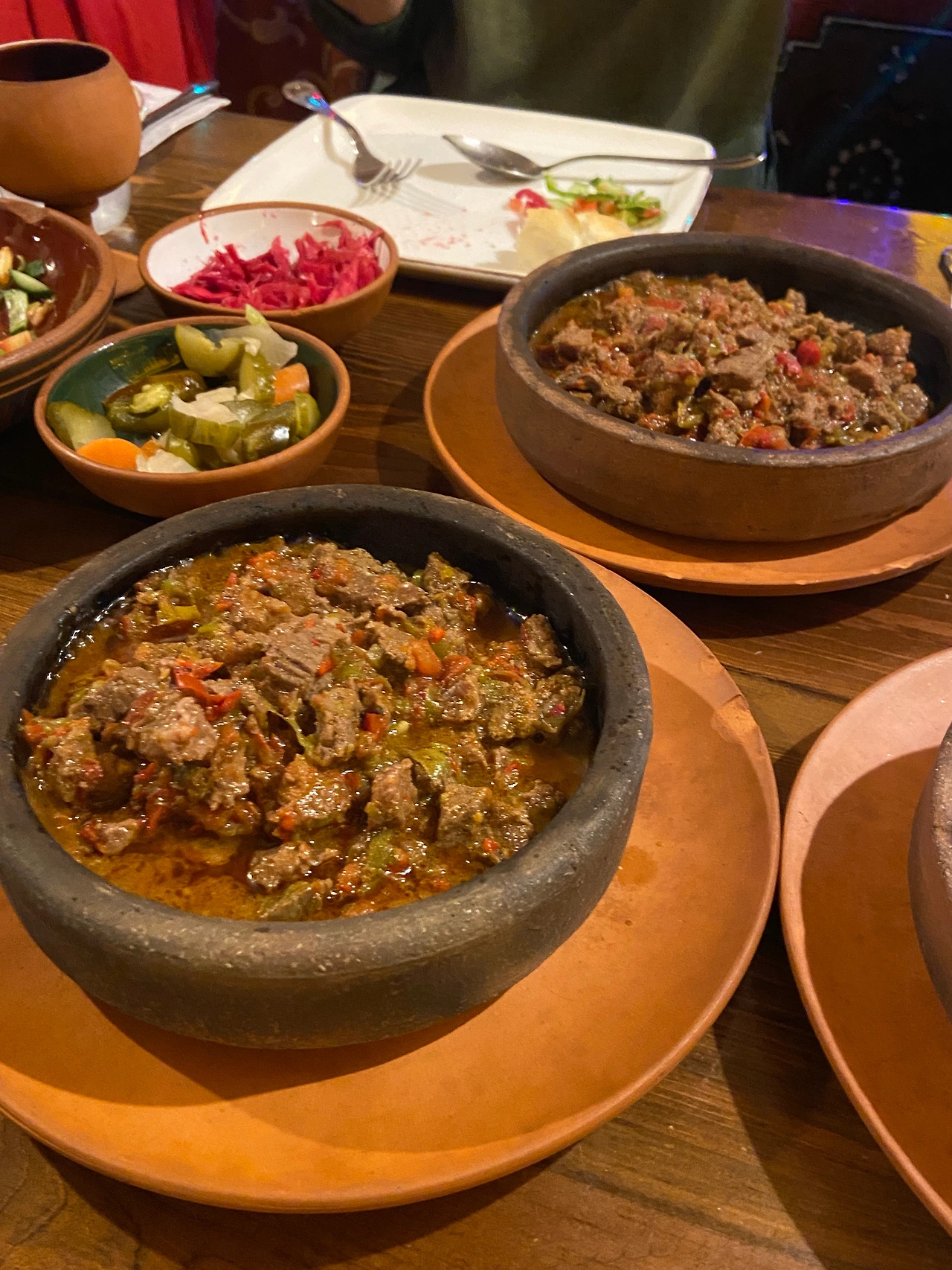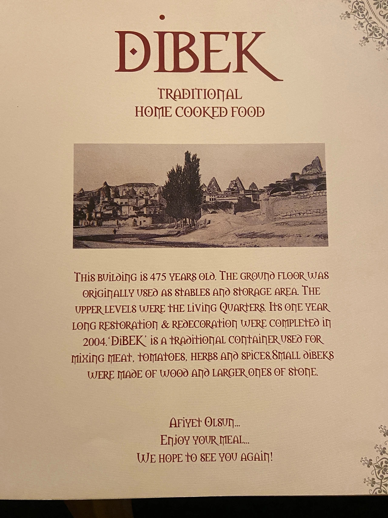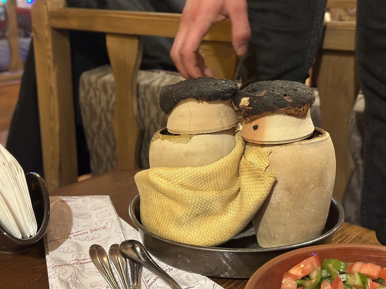 카파도키아에서 유명하다는 항아리 케밥을 시키고 민트, 수막, 오레가노, 파프리카 등 향신료 맛을 보며 주문한 음식을 기다렸다. 곧이어 불에 뜨겁게 달궈진 돌솥 그릇이 나오고, 손바닥보다 조금 큰 장독모양의 항아리가 도착했다. 항아리 윗부분은 밀가루반죽 같은 걸로 덮었는지 화덕 안에서 검게 탔고 몸뚱이는 연한 갈색빛이었다.