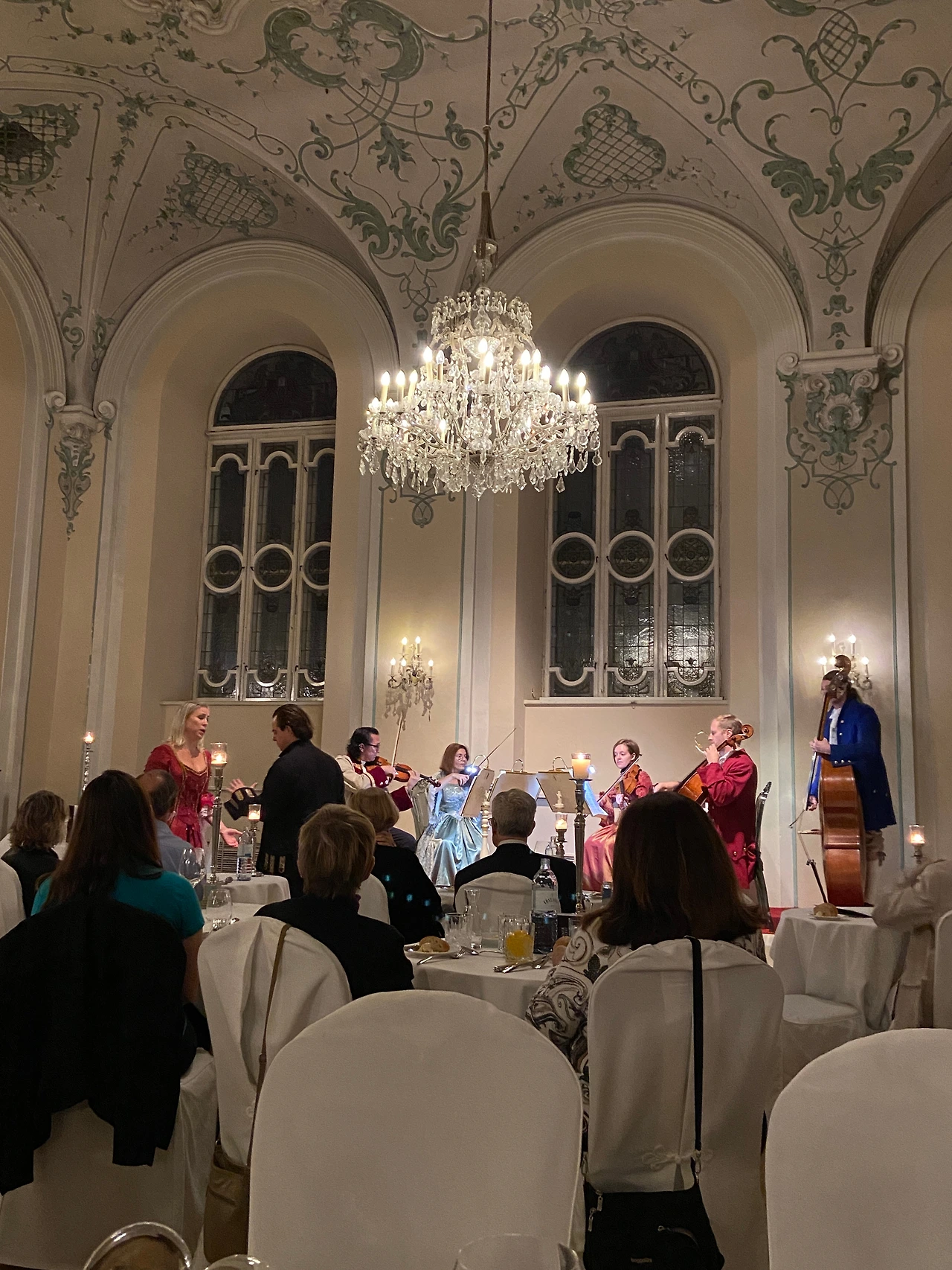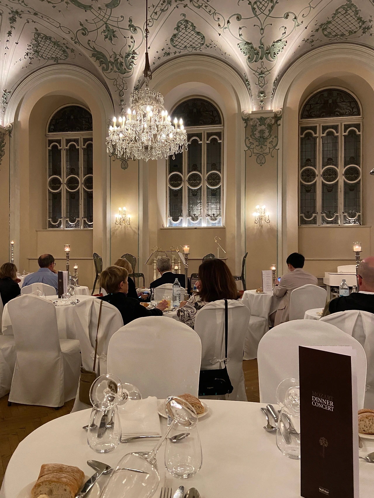 반듯하게 다려진 새하얀 테이블보로 덮인 원형 테이블이 홀을 가득 채웠고 아치형 창문 앞에는 네 개의 의자가 놓인 작은 무대가 있었다. 정갈하게 세팅된 테이블 위 브로셔를 펼쳐 보니 오른쪽에는 식사 메뉴가, 왼쪽에는 공연 순서가 적혀있었다. 코스로 구성된 메뉴와 식사 사이를 음악으로 채우는 디너이자 모차르트 콘서트. 총 3부작으로 나누어진 공연은 각 세션마다 6-7곡으로 구성되어 있었다.