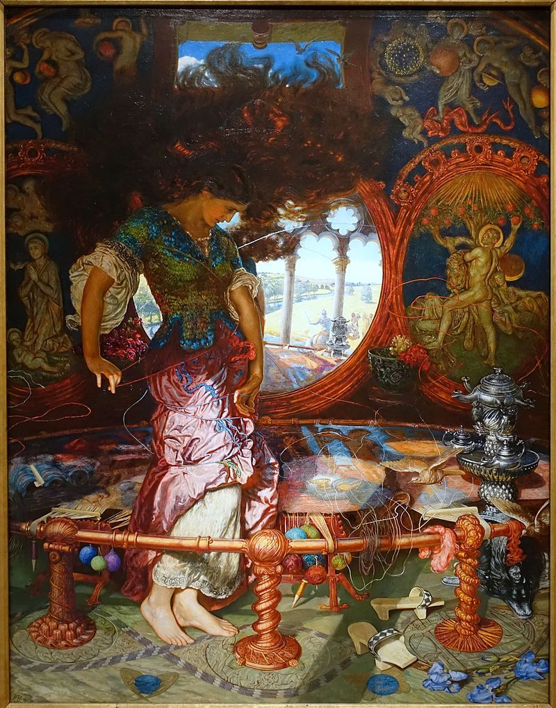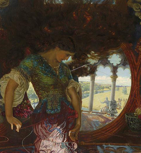 윌리엄 홀먼 헌트( William Holman Hunt, 1827-1910)의 작품은 테니슨 시의 극적 분기점인 샬롯의 여인이 금기로 여겨졌던 창밖을 직접 바라보아 저주가 시작되는 바로 그 순간을 정교하게 표현했습니다. 시에서 샬롯의 여인은 카멜롯 인근의 탑에 유폐되어 거울에 비친 세상만을 보며 태피스트리를 짜도록 저주받은 존재입니다. 어느 날 화려하게 무장한 기사 랜슬롯의 모습에 매료됩니다. 견딜 수 없는 갈망에 처음으로 창밖을 직접 바라보자마자 거울이 깨지고, 저주가 현실이 되어버립니다. 이후 여인은 스스로 이름을 배에 새기고 강을 따라 카멜롯으로 떠나 최후를 맞이합니다.