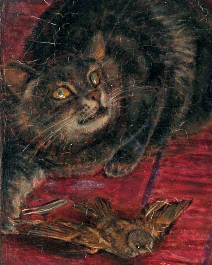 이 방은 새로 꾸며진 화려하고 값비싼 인테리어로 가득 차 있습니다. 그래서 전형적인 빅토리아 시대의 중산층 가정과 명백히 구분됩니다. 벽에는 당대 유행하던 프린트와 미완성 태피스트리가 걸려 있고, 바닥에는 풀린 실타래와 버려진 장갑 등이 어지럽게 흩어져 있습니다. 탁자 아래의 고양이가 부상당한 새를 가지고 노는 모습은 여성의 위태로운 처지를 은유적으로 보여줍니다. (고양이 =남성, 새 =여성)