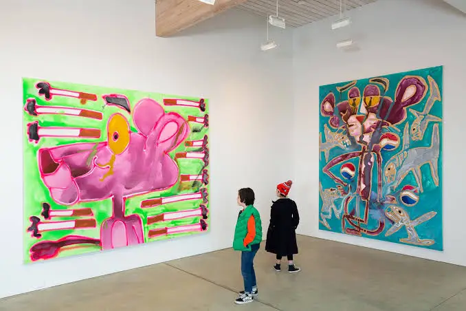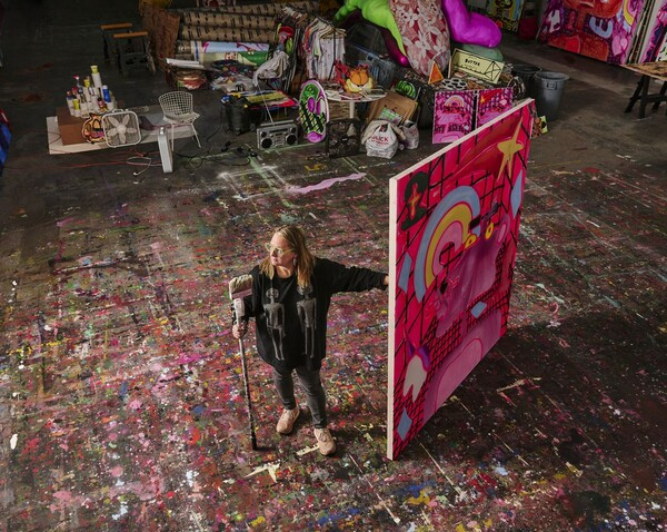 핑크 팬더, ET, 심슨 가족, 나이키 운동화, 과일, 화장지 등 대중문화의 친숙한 소재와 일상적 사물을 화면에 반복적으로 패턴화해 묘사합니다. 추상과 만화적 요소가 섞인 단순하고 직설적인 색채 , 스프레이와 아크릴을 활용한 거친 붓질이 그녀의 스타일이죠. 평범한 것들을 배치의 논리 없이 강렬한 색과 리듬으로 배열해 시각적 쾌감을 선사합니다. 어린 시절과 소비문화를 아우른 유머와 에너지가 그녀 작품의 또 하나의 특징이고요. 미국 현대미술에서 21세기를 대표하는 에너지 넘치는 여성 화가 중 한 명입니다.
