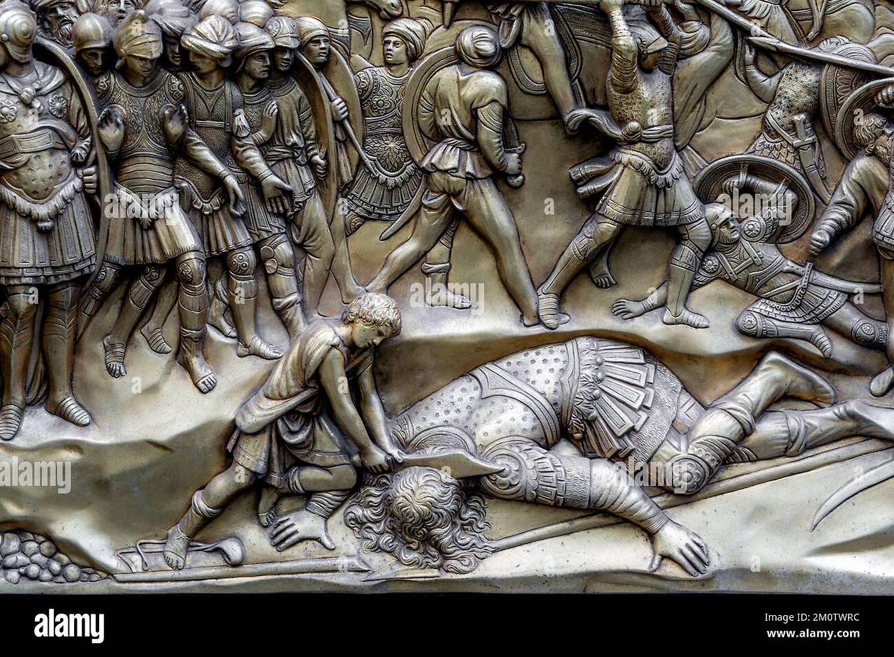 다윗과 골리앗의 이야기는 약자가 승리하는 주제를 강조합니다. 두 전사 사이의 키 차이를 사실적으로 묘사해 실감 나지요.