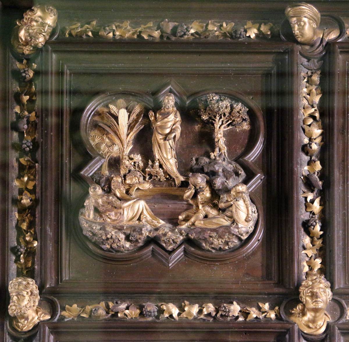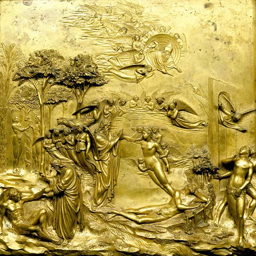 첫 번째 패널은 창세기입니다. 아담과 이브의 창조, 불순종, 에덴동산에서 추방되는 장면을 묘사합니다. 기베르티는 이 패널에서 이브를 중심인물로, 아담을 주변 인물로 묘사합니다.