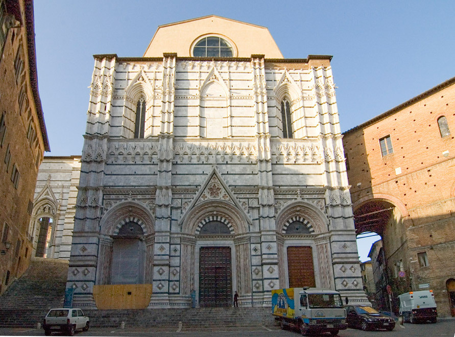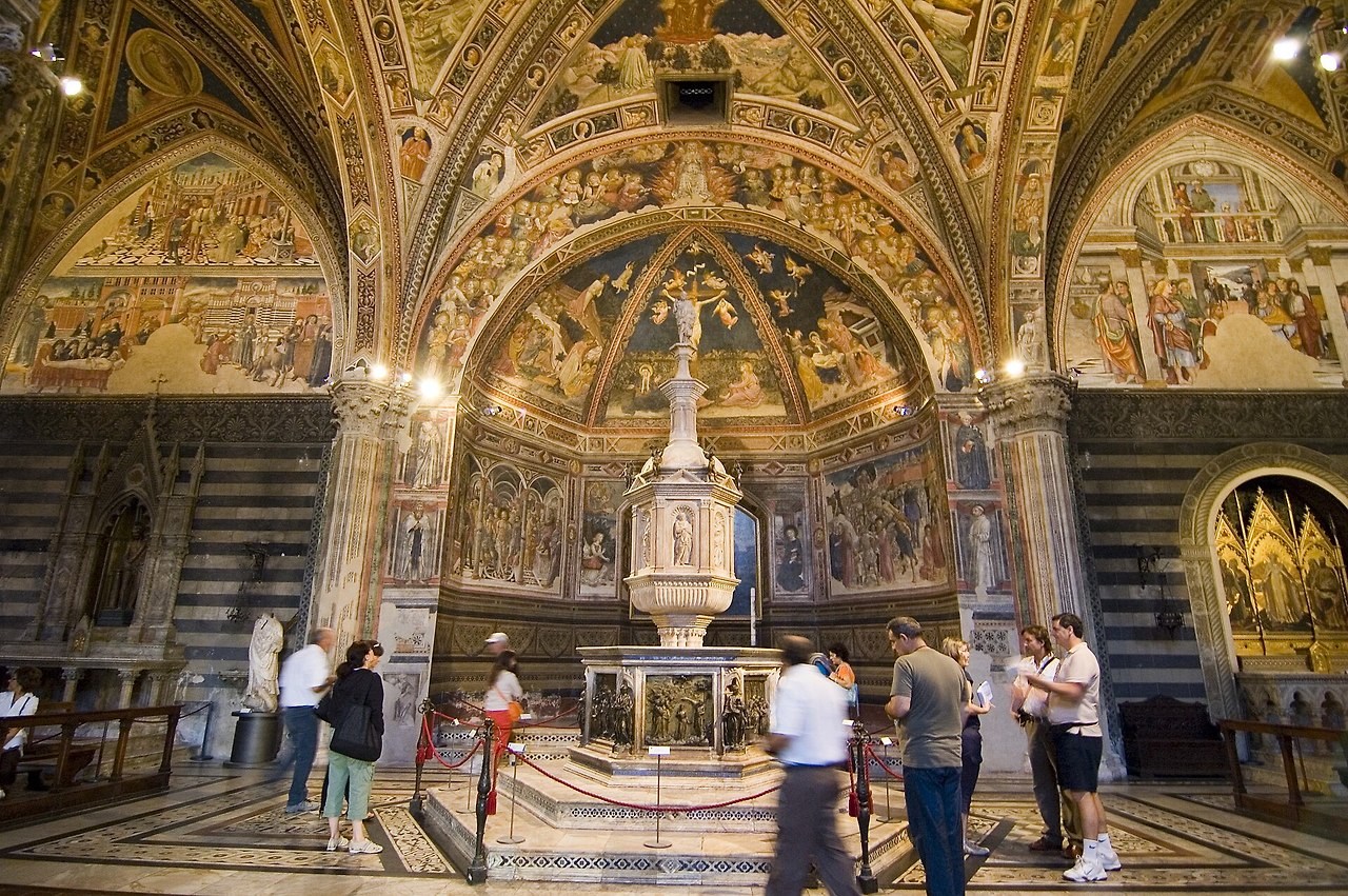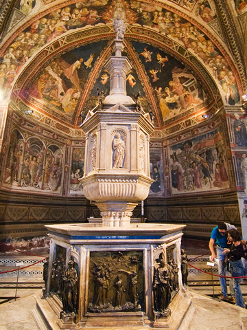 산 조반니 세례당(Baptistery of San Giovanni)은 시에나 대성당 아래에 위치해 있습니다. 1316년에서 1325년 사이에 지어진 초기 르네상스 예술의 중요한 증거가 되는 건물이지요. 세례당은 산 조반니 광장에 위치하며, 대성당의 아래에 독특하게 자리 잡고 있습니다. 고딕 양식으로 지어졌습니다. 파사드 상당 부분은 미완성 상태이고요. 내부에는 중앙에 육각형 세례반이 있는데, 이는 도나텔로(1386-1466), 로렌초 기베르티(1378-1455), 야코포 델라 퀘르차(1374-1438) 등 당대 주요 조각가들이 1417년에서 1431년 사이에 제작했습니다. 세례반의 청동 패널은 세례자 요한의 생애를 묘사합니다. 천장에는 베키에타( Vecchietta)와 그의 학파가 그린 프레스코화가 있습니다.
