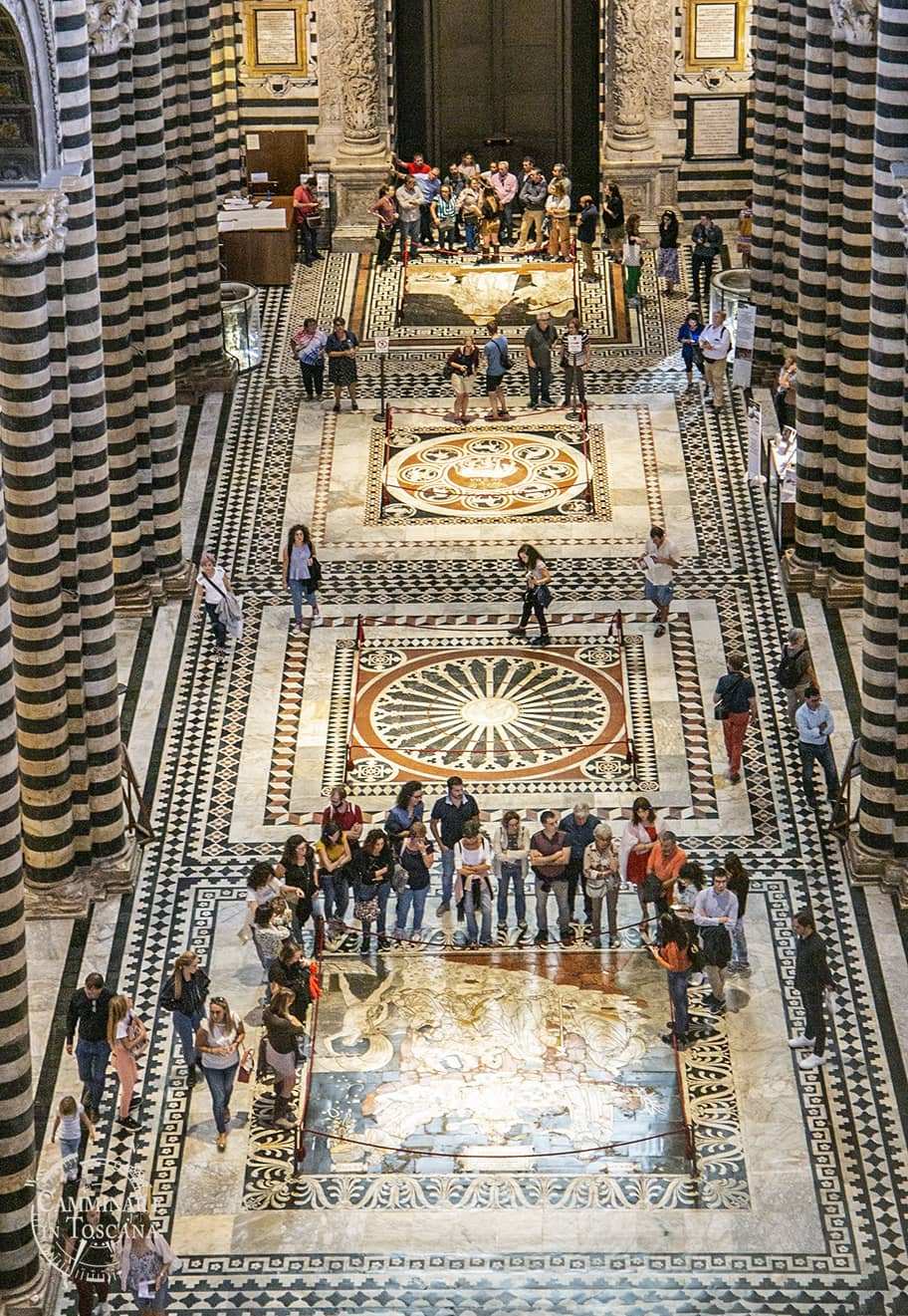 바닥 한번 보시죠. 조르지오 바사리(1511-1574)가 "가장 아름답고, 가장 크고, 가장 웅장한 바닥"이라고 극찬한 대리석 모자이크 상감 및 스그라피토 바닥은 대성당에서 가장 귀한 소장품 중 하나입니다. 이 바닥은 14세기에 시작되어 19세기에 완성되었으며 56개의 상감 패널로 구성되어 있습니다.