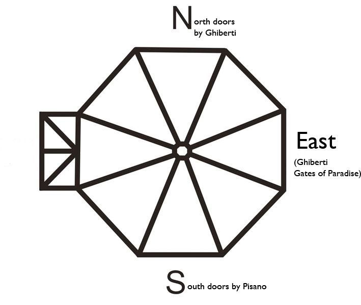 이 문은 원래 동쪽 출입구에 설치되었으나, "천국의 문"이 완성된 후 북쪽으로 옮겨졌습니다. 문은 아래에서부터 교회 박사들, 복음서 저자들, 그리고 그리스도의 생애 이야기가 묘사된 패널로 이루어져 있습니다. 북문은 또한 '십자가의 문'으로도 알려져 있습니다.
