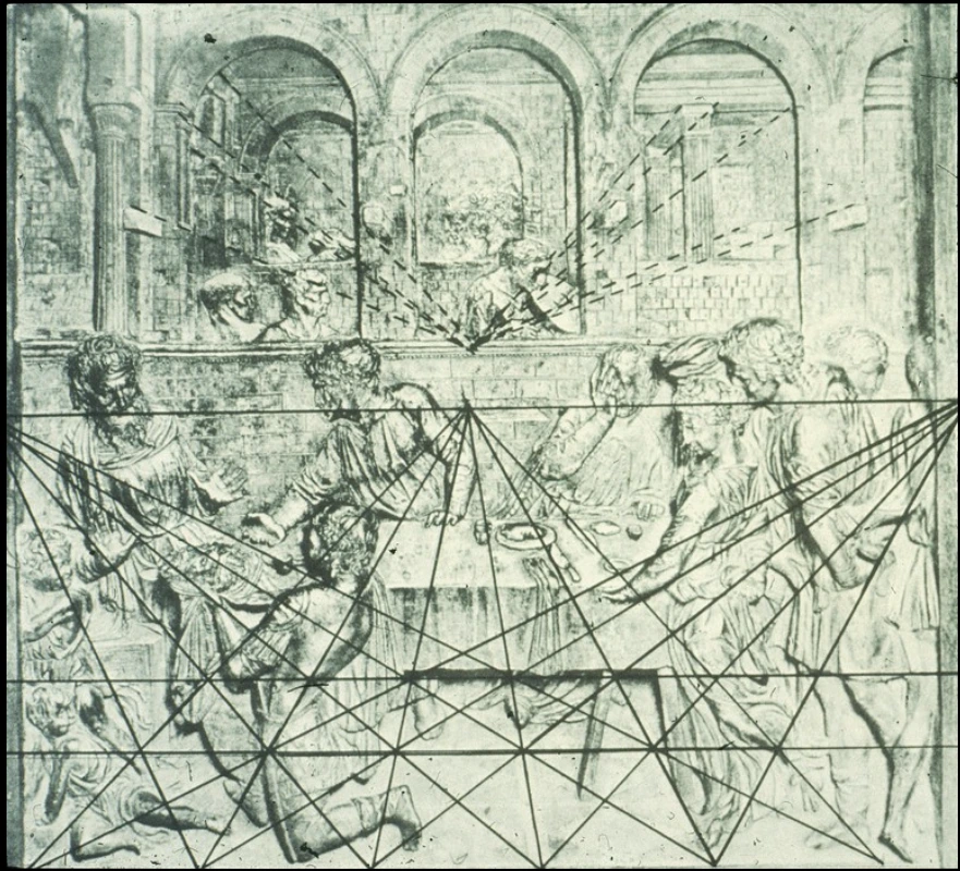 도나텔로는 하나의 소실점에 집중하는 대신, 'V'자 형 소실점을 사용하여 보는 사람의 시선을 장면 전체로 유도했습니다.