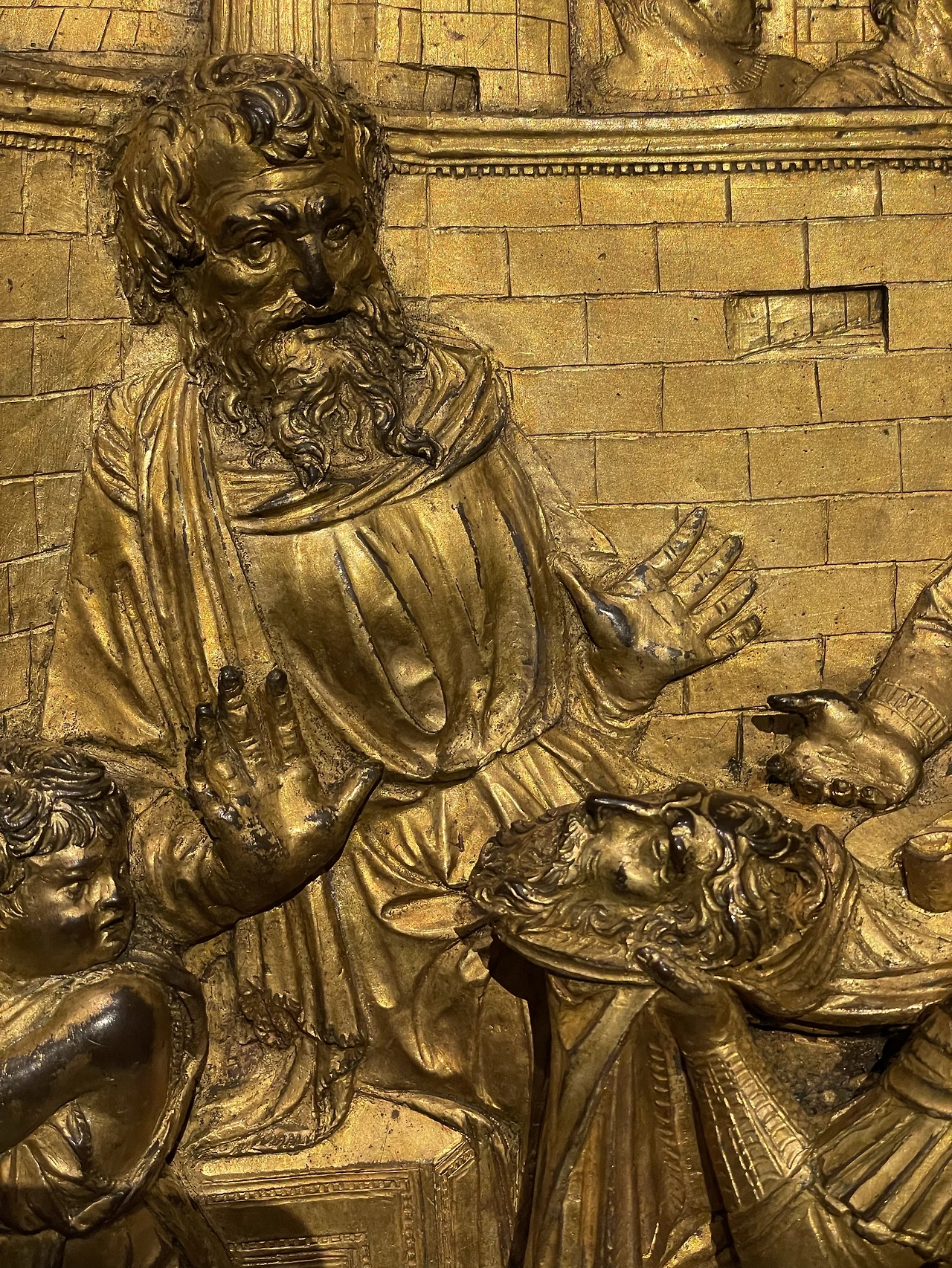 아브라함과 이삭의 이야기를 담고 있습니다. 오른쪽 윗부분에 아버지 아브라함이 칼을 들고 있고, 천사가 급하게 내려와 말리는 모습이 보입니다. 조금만 늦었다면 큰일 날 뻔했습니다. 배경에는 나무들과 돌들이 정밀하게 묘사되어 있어서 관람자들이 한번 만져보고 싶어 더 가까이 다가가게 합니다.
