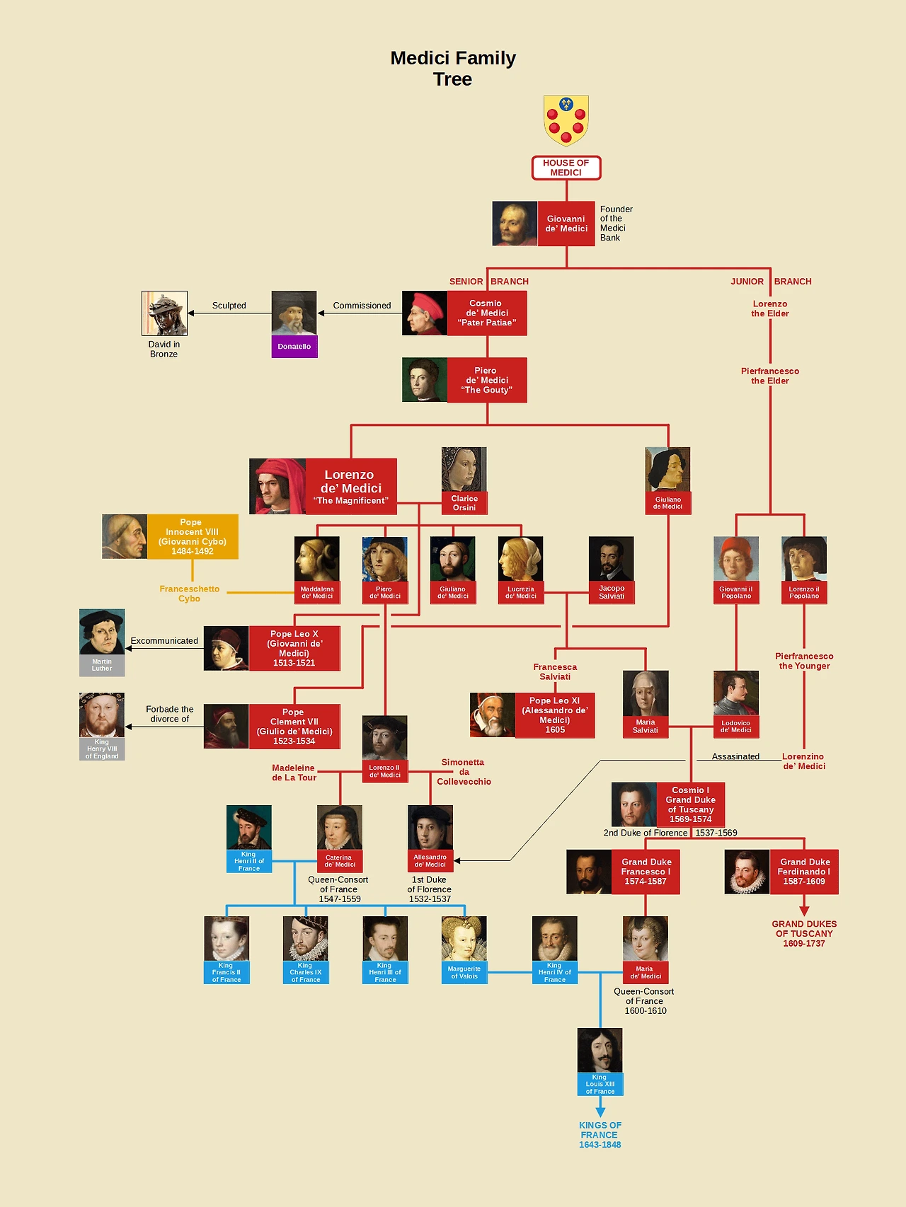 메디치 가문은 14세기 초부터 직물 교역과 은행업을 통해 막대한 부를 축적하며 피렌체 사회에 등장했습니다. 특히 조반니 디 비치 메디치(Giovanni di Bicci de Medici, 1360-1429)가 1397년 메디치 은행을 설립하며 유럽 전역에 지점을 확장하여 금융 제국을 건설했습니다. 그의 아들 코시모 데 메디치( Cosimo de' Medici, 1389-1464)는 재산을 기반으로 1434년에 알비치 가문을 축출하는 사실상의 쿠데타를 성공시키며 피렌체의 실질적인 통치자가 되었습니다. 코시모는 공식적인 관직에 많이 오르지 않고 뒤에서 도시의 주요 결정을 좌우하는 '무관의 제왕'으로 불렸습니다.