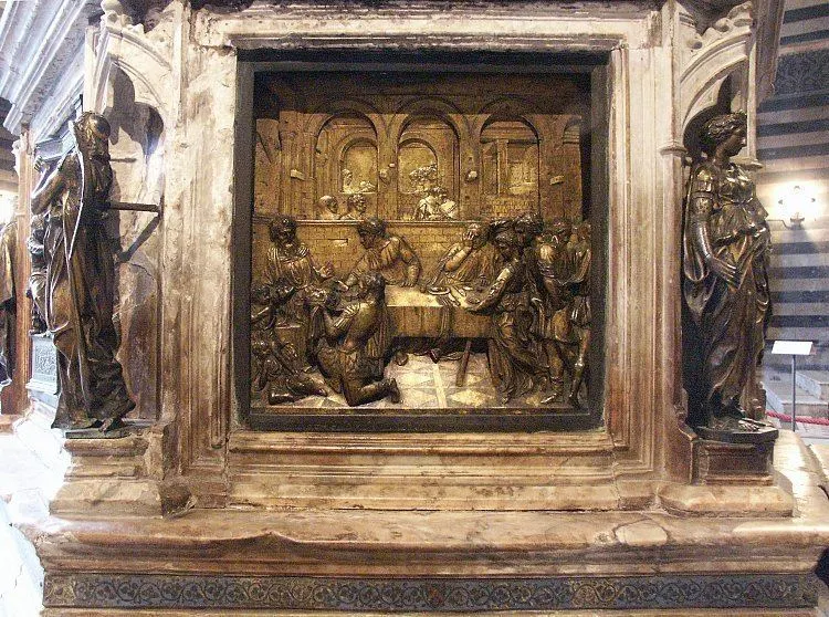 시에나 세례당의 세례반 부조 중 로렌초 기베르티( Lorenzo Ghiberti)가 제작한 부분은 1427년경에 만들어진 금박 청동 작품으로 , <세례를 받으시는 그리스도>를 주제로 합니다. 이 부조는 시에나 대성당 아래에 위치한 세례당의 세례반 한쪽 면을 장식하고 있습니다. 르네상스 초기 조각의 중요한 예시 중 하나이고요.