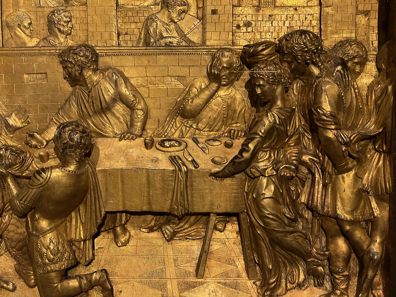 도나텔로(Donatello, 1386-1466)의 <헤롯의 향연>(1425-1429)은 이탈리아 르네상스 시대의 유명한 청동 부조 조각품입니다. 이 작품은 60*60cm 크기의 청동 부조 작품으로, 살로메가 헤롯 안티파스에게 세례 요한의 잘린 머리를 쟁반에 담아 달라고 요청한 후, 그 머리를 들고 있는 장면을 묘사합니다. 원근법과 사실주의를 혁신적으로 사용하여 주목받았습니다. 헤롯이 세례 요한의 잘린 머리를 보고 충격에 빠지는 장면이 묘사되어 있고요. 도나텔로의 초기 부조 조각 중 하나이자 그의 첫 번째 청동 부조라는 점에서 중요한 의미를 가집니다.