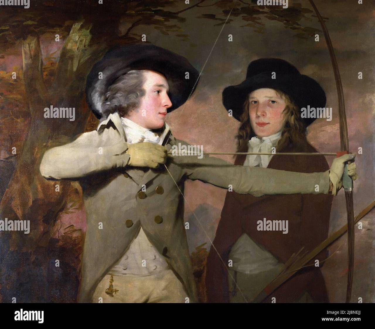 그림 속을 가로지르는 수평 화살은 캔버스를 정확히 이등분하며, 고전적인 조각 프리즈를 연상시키는 기하학적 균형감을 강조합니다. 이는 스코틀랜드 계몽주의 시대의 고대 미학에 대한 재관심이 반영된 것으로 해석됩니다. 인물들의 의상과 자세는 18세기 후반 스코틀랜드의 부유한 젊은이들의 모습을 보여줍니다. 당시 양궁이 사회적 지위와 운동적인 우아함을 상징하는 패션이었음을 드러내고요. 로버트의 자신감 넘치는 자세와 로널드의 그림자 속에 가려진 모습은 작품에 서정적이고 낭만적인 느낌을 더하는 동시에, 형식적이면서도 깊은 감성을 담아냅니다.