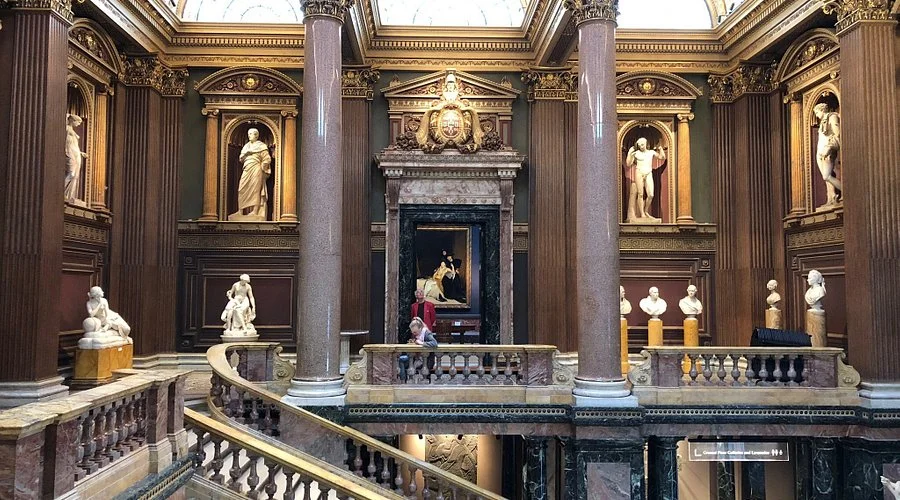 가장 인상적인 실내 공간 중 하나는 1대 데번셔 공작이 건설한 페인티드 홀 ( Painted Hall)입니다. 손님에게 깊은 인상을 주기 위해 설계된 이 거대한 공간은 루이스 라게르( Louis Laguerre)가 그린 율리우스 카이사르( Julius Caesar)의 삶을 묘사한 벽화로 가득합니다. 로마 개선문( triumph arch)을 연상시키는 계단은 로마 테마를 보완하며, 흑백 할리퀸( harlequin) 대리석 바닥, 금박 장식, 바로크 예술이 극적인 효과를 더합니다.