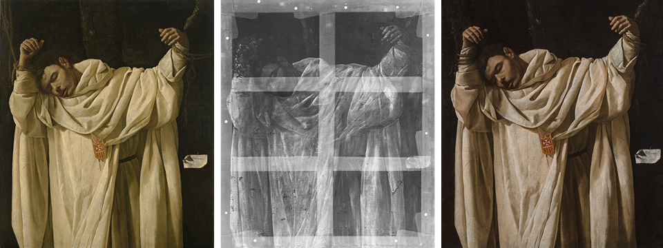 X- 레이 복원 연구를 통해 캔버스 뒤의 나무 들것 (stretcher) 구조가 십자가 형태를 띠고 있음이 밝혀졌습니다. 이는 그림을 구성하는 물리적 요소조차 순교의 신성한 의미와 연결시키려는 수르바란의 깊은 통찰을 보여줍니다.