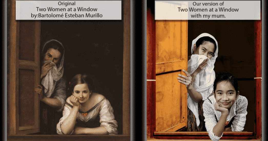 작품은 두 여인이 직사각형 창문틀 안에 배치된 구도를 가지고 있습니다. 뒤편의 어두운 실내 배경은 인물들에게 집중도를 높여줍니다. 창문은 그림의 경계 역할을 하고요. 한 젊은 여인은 창문턱에 기대어 그림 밖을 향해 매혹적인 미소를 짓고 있습니다. 다른 나이 든 여인은 반쯤 열린 덧문 뒤에서 웃음을 감추고 있고요. 이러한 구도는 관람자를 직접 작품 속으로 끌어들이는 효과를 만들어냅니다. 마치 실제 창문을 통해 두 여인을 엿보는 듯한 착각을 불러일으키고요. 무리요(1617-1682)는 플랑드르 회화에서 흔히 볼 수 있는 '트롱프뢰유(trompe l'oeil, 눈속임)'기법을 활용하여 그림과 현실 사이의 경계를 모호하게 만들었습니다. 실제로 이 작품은 복원 과정에서 젊은 여인이 팔을 기대고 있는 창문턱이 별도의 천 조각으로 덧대어 그려졌다는 사실이 밝혀졌습니다. 이러한 입체적 효과를 의도적으로 연출했음을 알 수 있습니다.