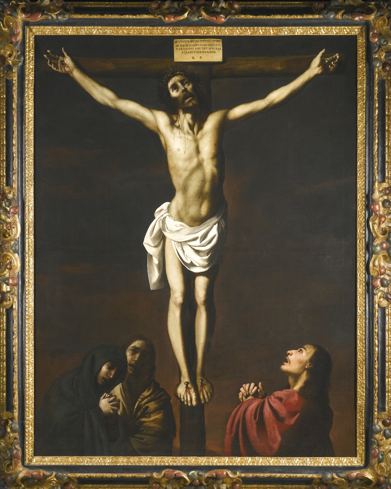 프란시스코 파체코의 교리적 지시에 따라 그리스도의 발이 교차되지 않고 각각 못 박혀 평행하게 놓여있는 모습은 당시의 주류와는 다른 독특한 도상학적 특징입니다. (벨라스케스의 1632년작 '십자가에 못 박힌 그리스도 Christ Crucified'작품과 비교해 보세요.)