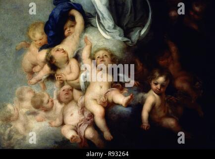 무리요(1617-1682)는 이 작품에서 부드럽고 감성적인 화풍과 탁월한 기술을 결합하여 성모 마리아의 순수하고 신성한 이미지를 창조했습니다. 작품의 구도는 성모 마리아가 화면 중앙에 수직으로 배치되어 하늘로 솟아오르는 듯한 역동적인 움직임을 보여줍니다. 마리아는 구름과 수많은 아기 천사들( Cherubs)에 둘러싸여 있습니다. 이들은 성모를 아래에서 받치거나 주변을 날아다니며 전체적인 상승감을 강조합니다. 특히 무리요는 아래쪽에서 위쪽으로 대각선 방향으로 향하는 빛의 흐름을 통해 성모의 승천을 시사하는 분위기를 조성했습니다. 이러한 배치는 보는 이로 하여금 경건함과 동시에 따뜻한 정서적 울림을 느끼게 합니다.