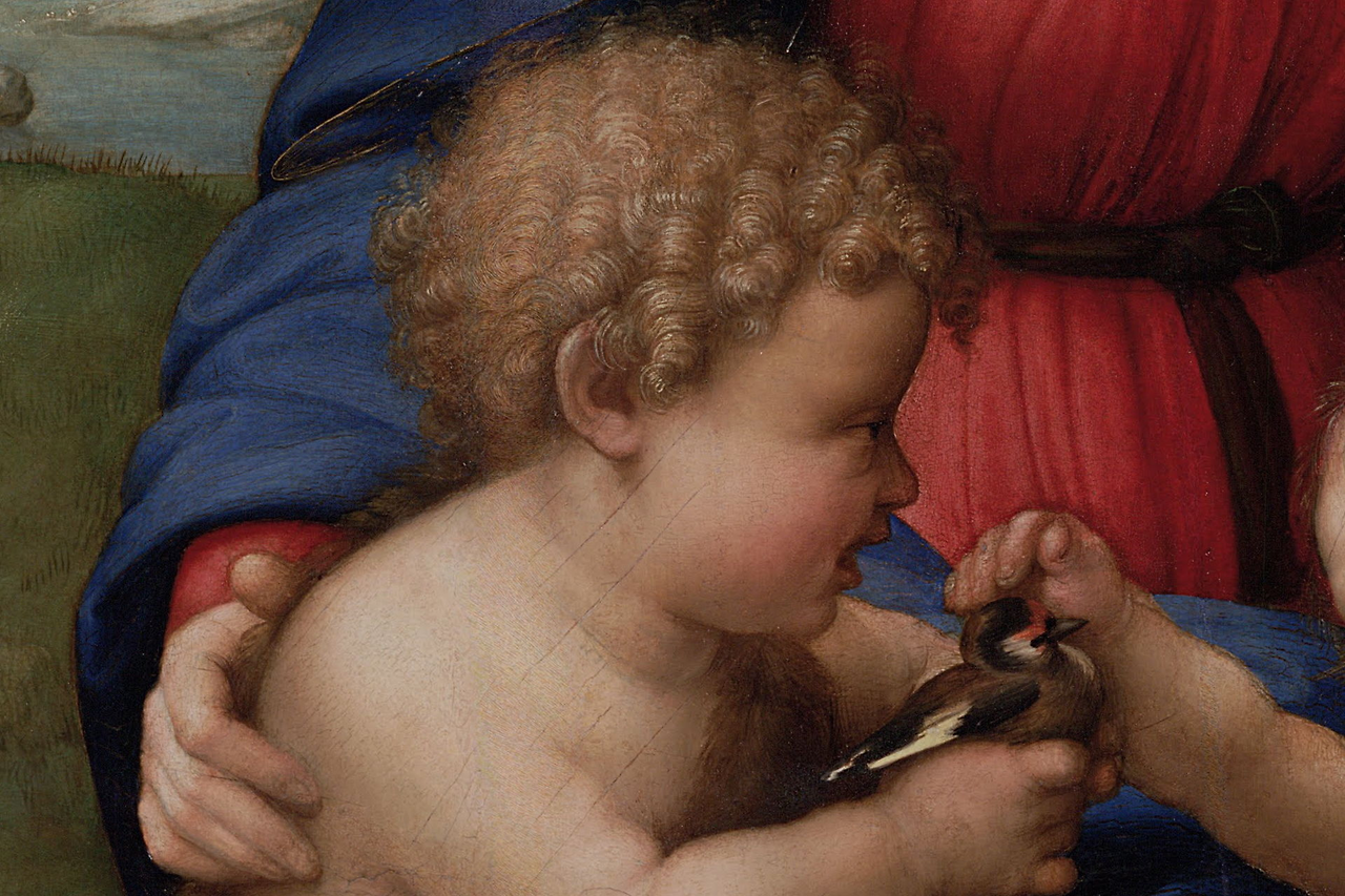 아기 예수가 손에 든 작은 새는 유럽산 금화조( European goldfinch)로 알려져 있습니다. 기독교 도상학에서 풍부한 상징적 의미를 지니고요. 금화조는 섬세한 크기와 연약한 형태 때문에 인간 영혼의 취약성을 나타냅니다. 또한 엉겅퀴 씨앗을 먹는 습성 때문에 예수의 수난( Passion)을 암시합니다. 엉겅퀴의 날카로운 가시는 예수의 십자가형 당시 씌워진 가시관을 연상시키고요. 성가족의 삶에 내재된 고통을 예고합니다.