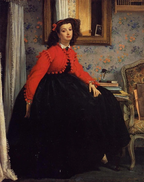그림(왼),1864년 티소는 살롱에서 초상화를 선보입니다. 거대한 캔버스에 그려진 동시대 신흥 부르주아 집안의 소녀입니다. 흰색, 빨간색, 검은색이라는 파격적인 색상대비와 옷 장식, 화려한 벽지의 패턴과 의자의 디자인까지 눈을 뗄 수가 없네요. 고개를 쭉 빼고 가까이 다가가 한참을 선 채 보고 있을 것 같습니다. 세련된 벽지 디자인이 지금 사용해도 별 무리가 없어 보이고요. 작가의 섬세한 데생과 대조적인 색상의 사용, 치밀한 관찰력은 20대 후반에 이미 완성했다 할 정도로 뛰어납니다. 이런 질감에 대한 섬세한 표현의 시작은 모자가게와 직물상을 운용했던 부모밑에서 자란 영향일 겁니다. 당대 유행하는 복식과 취미, 집안의 인테리어를 그대로 재현해 내 보는 재미를 더해줍니다.