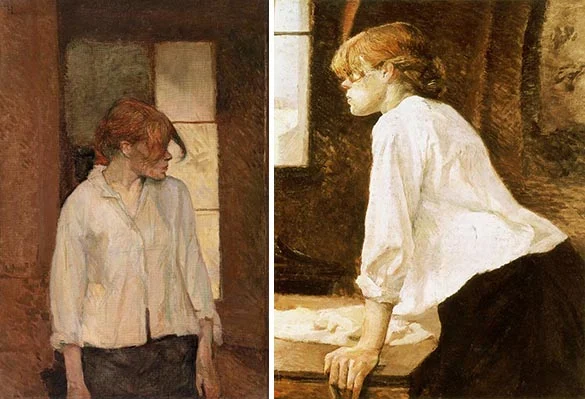 '몽마르트르의 작은 거인'으로 불리던 그가 어느 날 수업을 마치고 친구 앙리 라슈(Henri Rachou)와 식사 중에 빨간 머리의 카르망 고댕(Carmen Gaudin)을 만나게 됩니다. 빨간 머리에 꽂혔지요. 당시 고댕은 23살 세탁부였고요. 그림 속 젊은 그녀는 창밖을 보며 무슨 생각을 하고 있었을까요? 응시하는 눈빛, 다부진 옆모습, 테이블을 잡고 있는 거친 손이 마치 항변하는 것 같습니다. '언제 이 생활을 때려치울 수 있을까? 내 꿈은 저 밖에 있는데... 언제 저 문을 열고 당당하게 나갈 수 있을까?'뭐 이런 불만 어리고 답답한 느낌이 그녀의 뒷모습에 읽히는 듯합니다. 그녀는 후에 로트렉의 모델이 되고 13점 회화와 드로잉 몇 점이 나오게 됩니다.