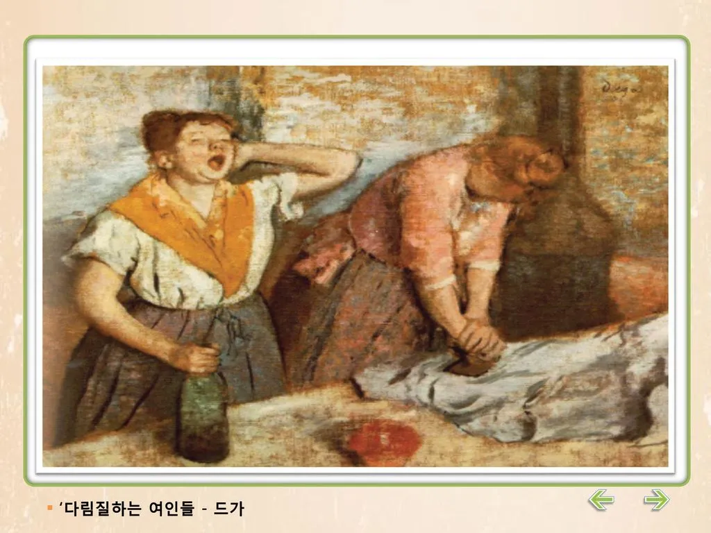 그림(오), 에드가 드가의 <다림질하는 여인들> 작품입니다. 극장 혹은 발레리나 그림으로 유명하지요. 잘못 찍은 그림사진 같은 그림으로 현장의 생생함을 전달하고자 했던 화가이기도 합니다. 냉랭한 드가의 시선이 세탁소에서 일하는 여성에게 꽂혔네요.