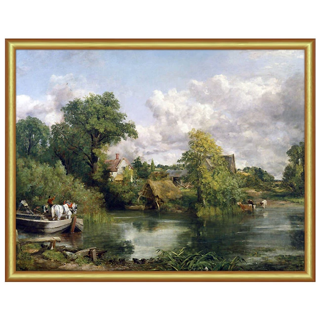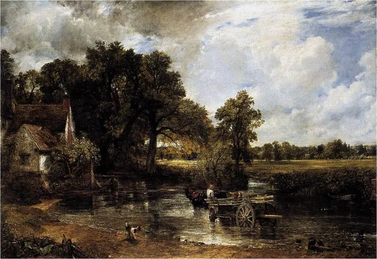 배경은 영국의 서포크 지방 스투어 강변의 한 평범한 농가 마을 데덤입니다. 그가 나서 자란 곳이죠. 무성하게 우거진 초록빛 배경에 대기와 빛이 변화는 모습을 그렸습니다. 원경에서는 농부들이 목초지에서 건초를 베어내고 있습니다. 전경 얕은 물가를 지나가는 마차가 바로 목초지로 향하는 길이고요. 마차 위 소년은 강아지를 부르고 있네요. 조각배를 탄 낚시꾼이 일어서서 습지를 낚싯대로 드리우고 있고요. 지붕과 굴뚝, 그리고 마차 마구의 붉은색이 초록과 보색 대비를 이루고 있습니다.