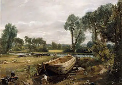 그림(오), 아버지의 사업을 물려받는 대신, 컨스터블은 아버지 소유의 방앗간, 옥수수 농장, 선박 건조장 풍경을 담아냈습니다. 그의 작품 <플랫포드 밀 근처에서의 배 만들기 <Boat-building near Flatford Mill,1815>입니다. 이 그림은 처음부터 완성까지 야외에서 그려진 그림이라고 합니다. 자신에게 영향을 받은, 인상파로 치면 '외광파'에 속하는 수련 연작의 '모네'처럼 말이죠.