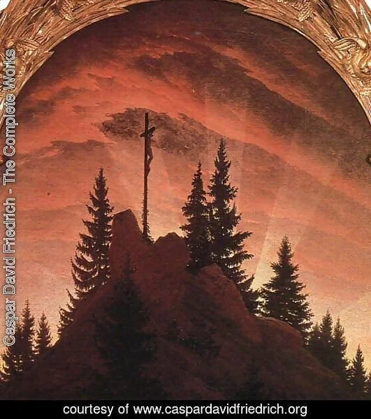 그림(왼), 프리드리히의 작품은 비교적 이른 시기부터 그에게 명성을 가져다줍니다. 위 작품은 전통적인 종교화의 상징들을 대체하려는 노력으로 그린 그림이라고 합니다. 보헤미아 지역을 여행하고 그린 그림이고요. 푸른 전나무나 담쟁이들은 그의 영적 감수성을 더 풍부하게 하는 소재로 쓰이고 있습니다. 그의 글에 따르면, 산은 믿음, 나무는 희망, 석양의 빛은 그리스도 이전의 세계의 종말을 상징한다고 합니다. 프리드리히는 풍경화가 종교적인 계시의 전달 수단이 될 수 있음을 깨달았습니다. 이 작품은 이러한 그의 생각이 잘 반영된 그림인 거죠. 이 작품의 주제는 그가 여러 번 사용한 주제이기도 합니다.