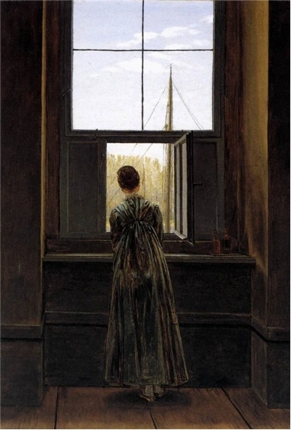 그림(왼), 뒤태가 단아한 여인이 창밖을 보고 있습니다. 프리드리히가 40대 시절에 만난 20살 아래의 아내 카롤린입니다. 그런 아내마저 뒷모습만 그렸습니다. 앞모습도 보여주시면 좋았을 텐데 말입니다. 아내가 있는 실내는 인테리어라고 할 만한 것이 딱히 없습니다. 어두운 단색의 직선의 모습이 오래되고 딱딱해 보이는 실내 풍경입니다. 오히려 열린 창문 밖 세상이 훨씬 화사합니다. 적막하고 정갈한 방 안과 대조적으로 연녹색의 포플러 나무숲과 지나가는 배의 돛대가 보입니다. 비록 강과 범선은 보이지 않지만, 지나가는 저 돛대만 보아도 먼 곳으로의 기나긴 여행을 상상해 보기 충분하죠. 비록 우리는 그녀의 얼굴과 표정을 볼 수 없지만 그녀의 시선을 따라 우리도 이쪽에 몸을 둔 채 더 넓은 저 편의 무한한 공간을 상상해 보게 됩니다.