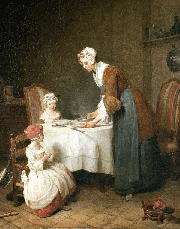 18세기 특유의 가족의 부드러움을 가미시킨 그의 작품은 교훈적인 무거움이나 과도한 감상은 보이지 않습니다. 조용하고 평화로운 분위기는 가라앉은 색 구성과 조용한 조명에 의해 더 강조됩니다. 샤르댕은 그의 그림들의 다양한 요소들의 배열에 많은 노력을 기울였습니다. 구성은 세밀하고, 세 인물의 삼각형 구조에서 만들어진 안정성 또한 그 장면의 고요함을 더합니다. 이 작품은 당시 루이 15세에게 선물로 바쳐졌고, 왕의 사망 이후 잊혔다가 1845년 재발견됩니다.